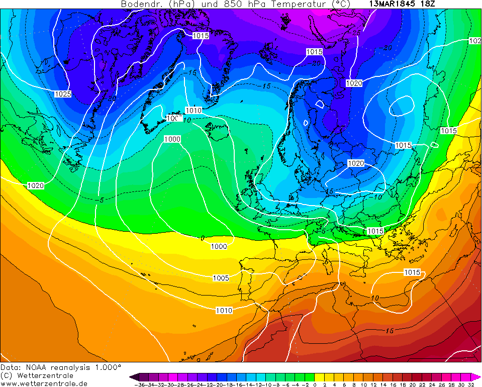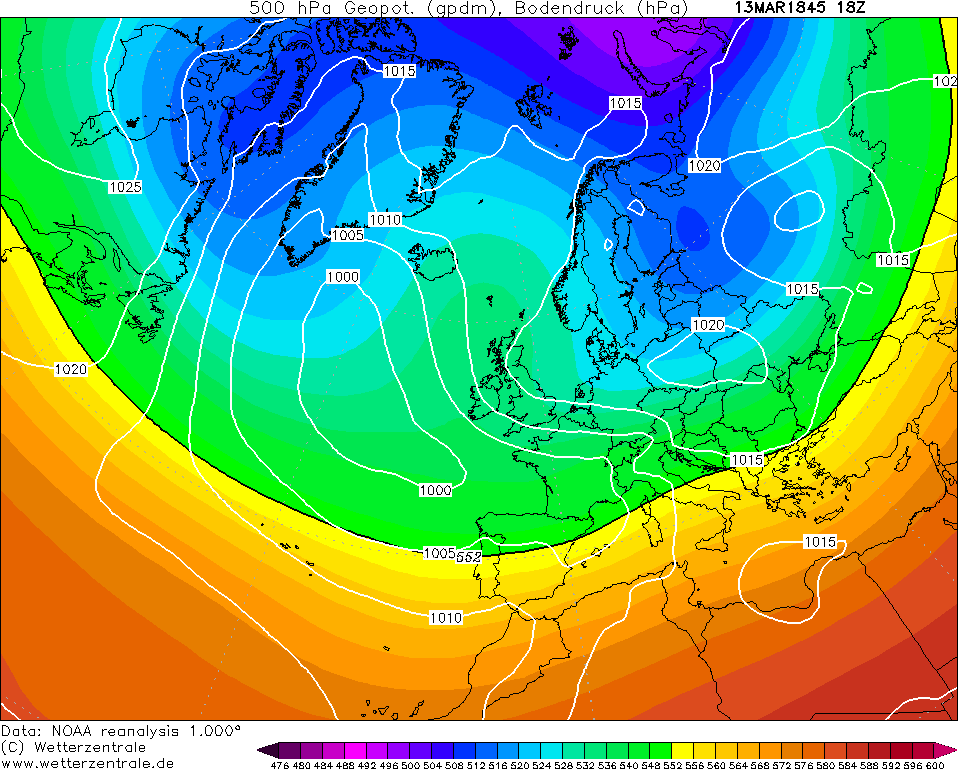 De kaart van 1845 lijkt me dan lastiger letterlijk te nemen. Die 13 maart zou redelijk zonnig verlopen zijn, dan ga je met de bijgaande kaarten niet die zeer uitzonderlijk koude maartdagen beleven. Dat je de 1845-kaart met een korrel zout moet nemen lijkt me wel zeker.
