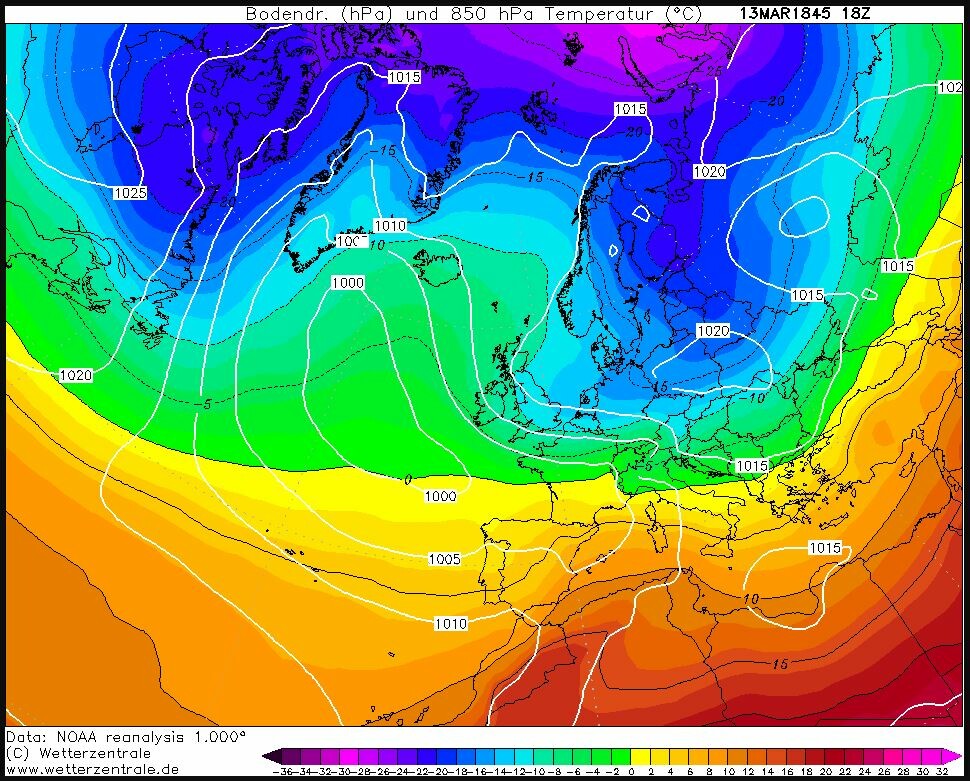 We zien dat Nederland op 13 maart 1845 volgens deze weerkaart vrijwel onder de as van hoge luchtdruk ligt, waardoor het in het noorden en midden van het land vrijwel windstil is en er in het zuiden een zwakke tot net aan matige oostelijke wind staat. We zien ook dat de 850hPa-temperatuur boven ons land rond -13 graden schommelt. Bij een droog adiabatische opbouw van de lucht in de middag vanaf dat niveau tot aan de grond, zou je een maximumtemperatuur van rond +2 graden kunnen verwachten.