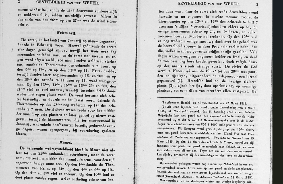 De kaart van 1845 lijkt me dan lastiger letterlijk te nemen. Die 13 maart zou redelijk zonnig verlopen zijn, dan ga je met de bijgaande kaarten niet die zeer uitzonderlijk koude maartdagen beleven. Dat je de 1845-kaart met een korrel zout moet nemen lijkt me wel zeker.