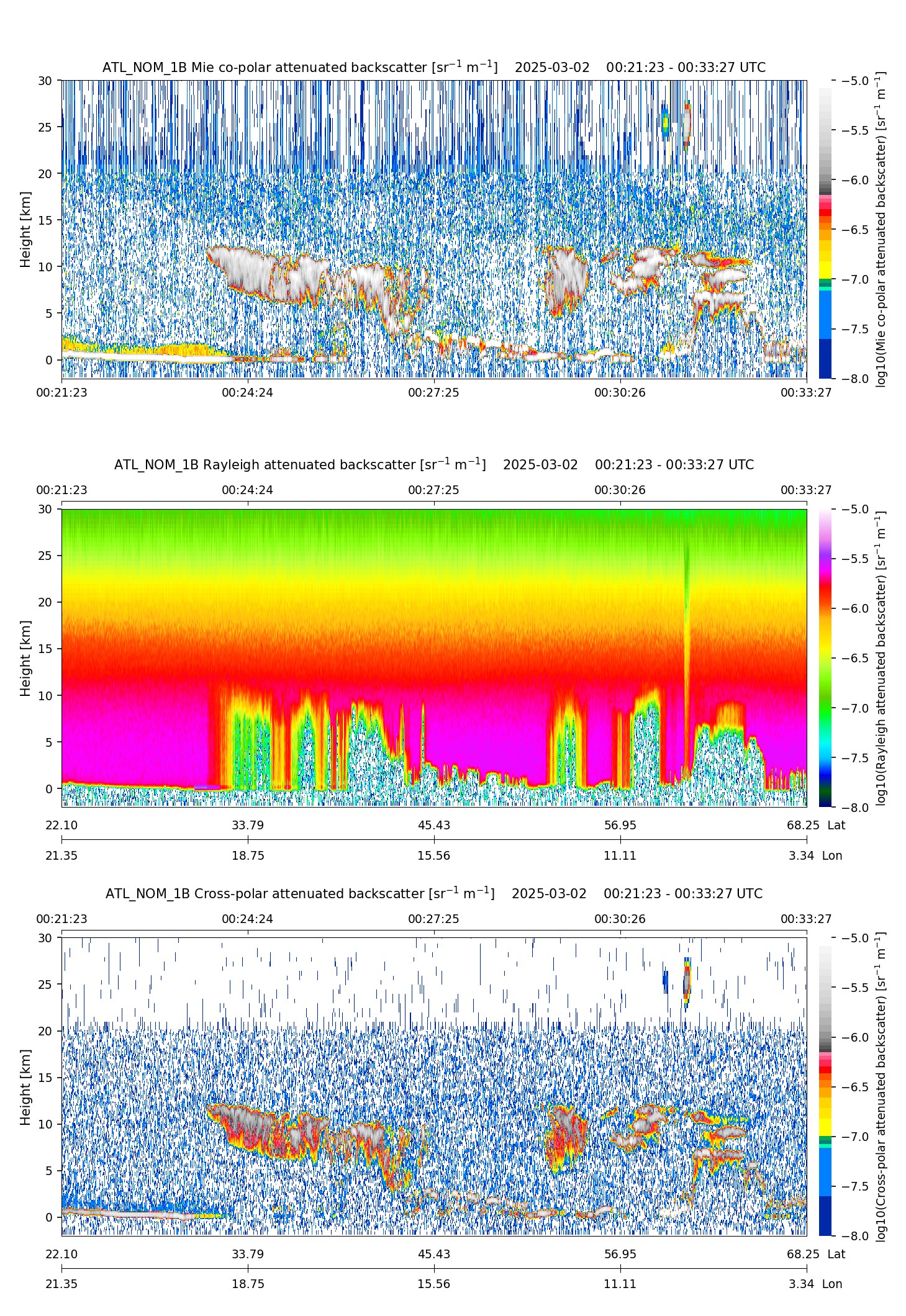 Ik denk dat ESA's EarthCARE gisternacht (2025-03-02 ~00:32 UTC) ook al iets detecteerde in de buurt van Oslo met de Lidar, zie onderstaande afbeelding. Rechtsboven zie je rond 25km en 59° latitude een klein van omvang maar duidelijk signaal.