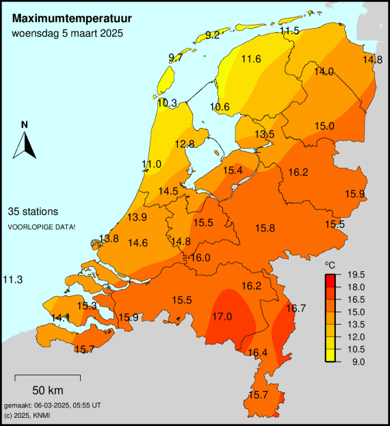 Dat leek me wel een mooie om te delen. Immers, op dinsdagavond gaf het RTL Weer aan dat het in Midden en Oost Nederland 13°C zou worden en het zuidoosten 15°C. De Weerplaza expertpluim schurkte tegen of op de 15°C aan voor Midden NL, dus ik vond dat wel een behoorlijk verschil op zo'n korte termijn. Uiteindelijk is de Tx nog wat hoger uitgekomen, dus wie weet in de komende dagen wel ergens een twintiger..?