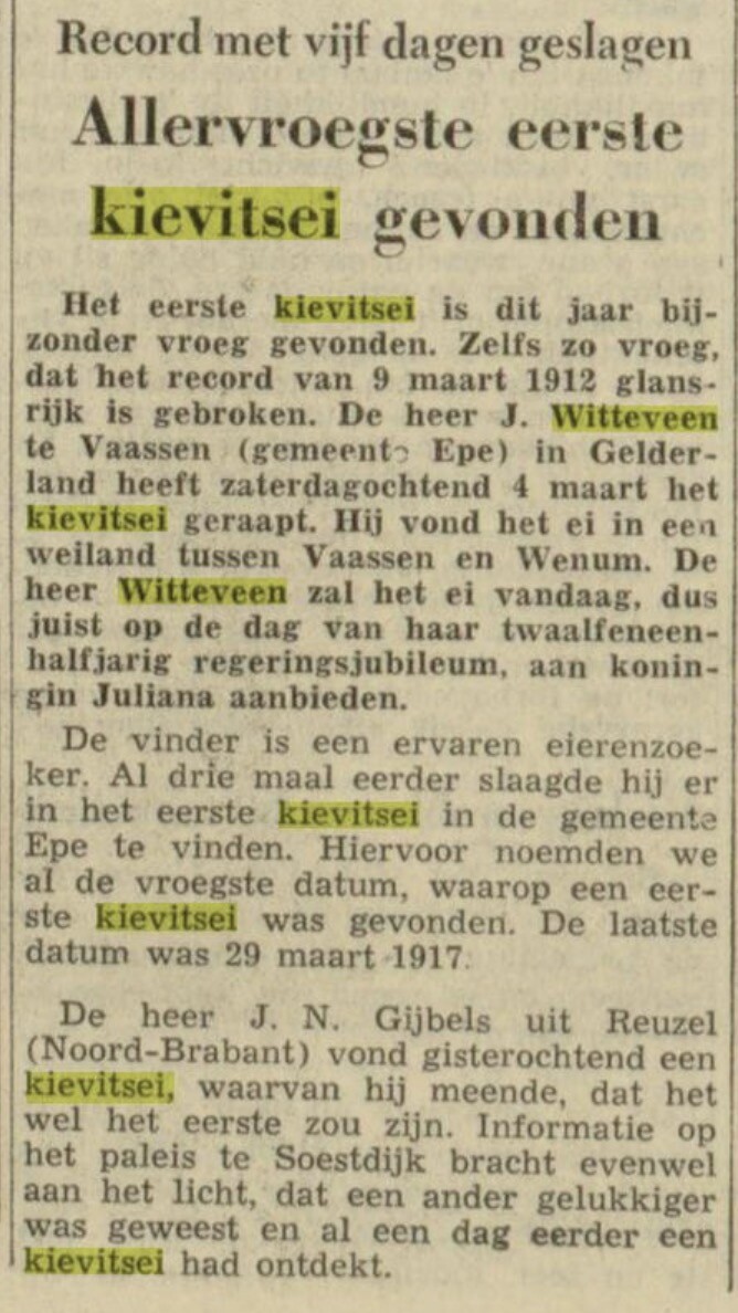 Ik moest het nieuwsberichtje even opzoeken via Delpher. Mijn oom, Jaap Witteveen heeft op 4 maart 1961 het eerste kievitsei gevonden. En heeft deze op 6 maart aan de koningin aangeboden.