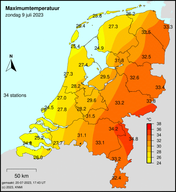 Dag later was het inderdaad veel benauwder. Arcen het warmst met 34,8. Net als Nieuw-Beerta afgelopen jaar met 34,9 net niet.
