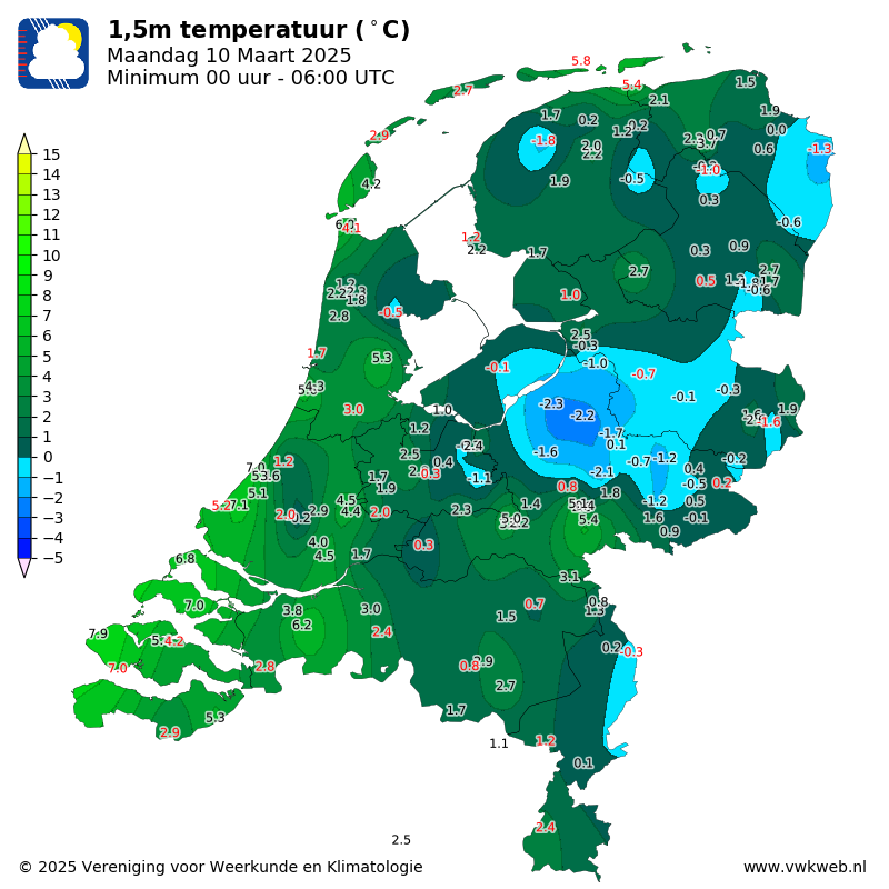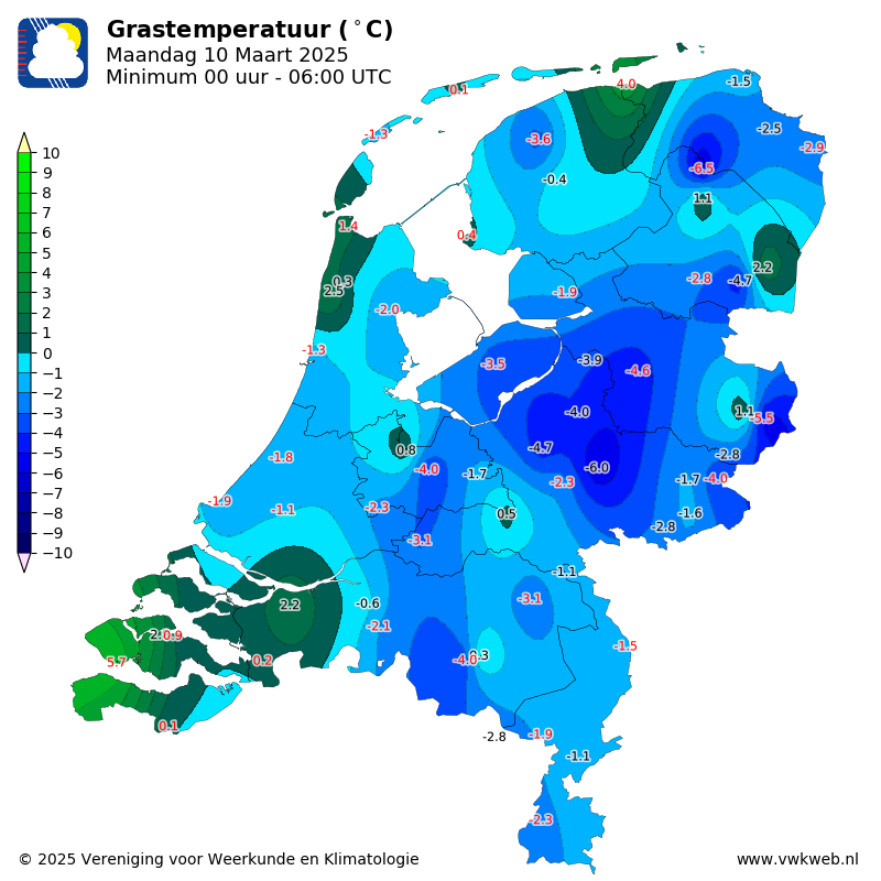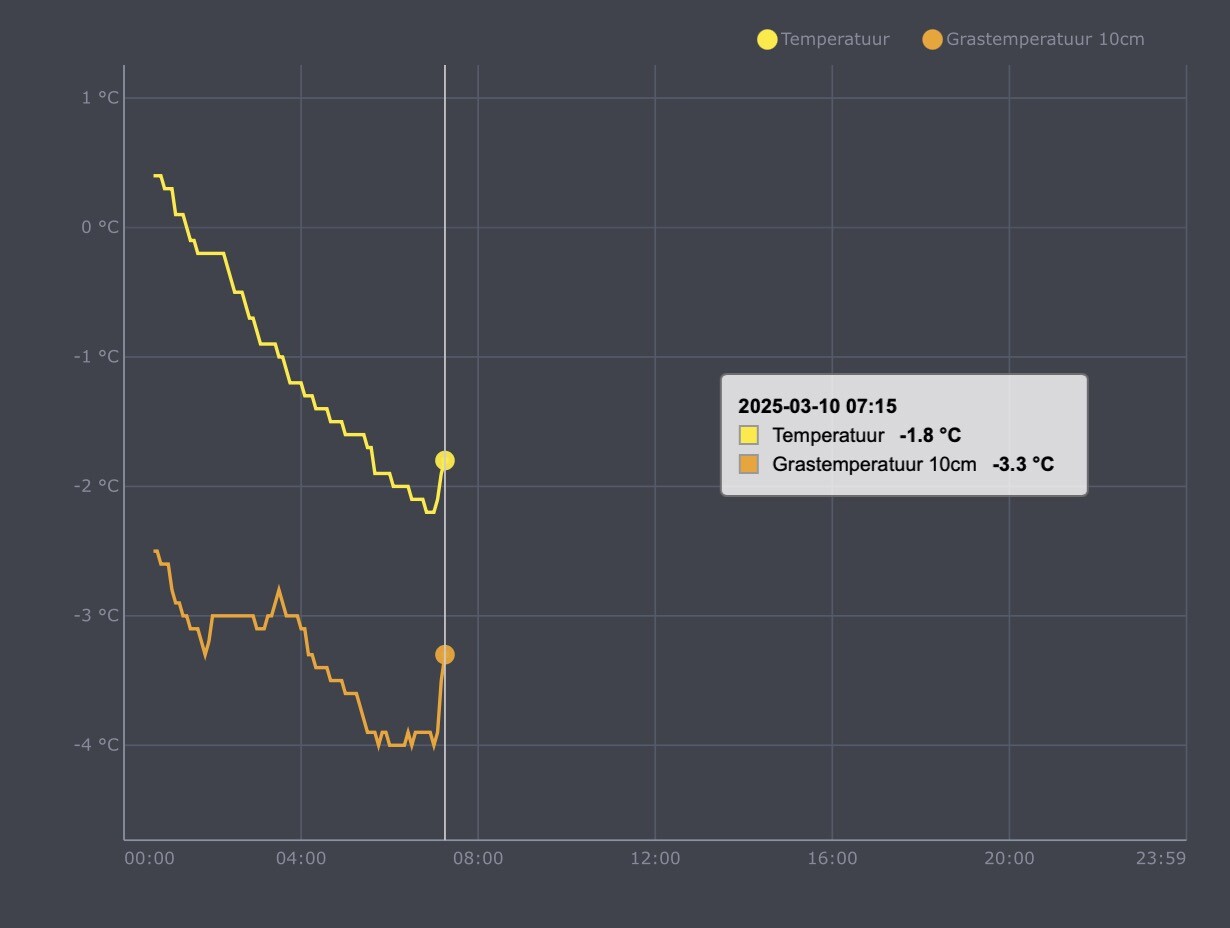 De Oost-Veluwe is alweer het koudste stukje NL vandaag. Op meethoogte was dat Vierhouten. Eelde 't koudst op 10cm hoogte.