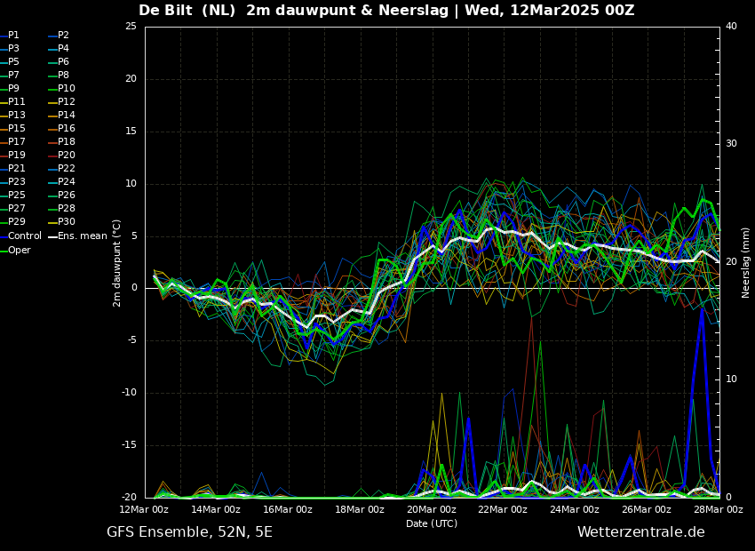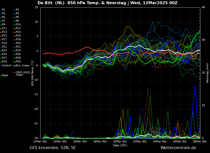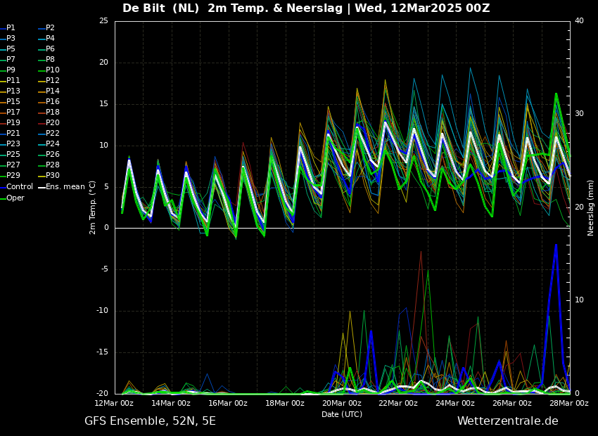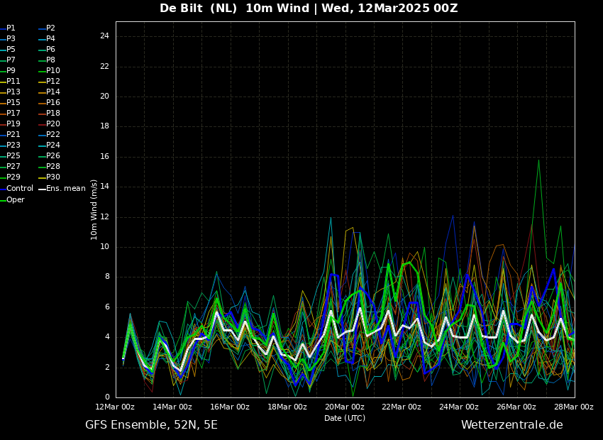 GFS ensemble 00Z. Hoog trekt door, daarna zuidwestelijke stroming