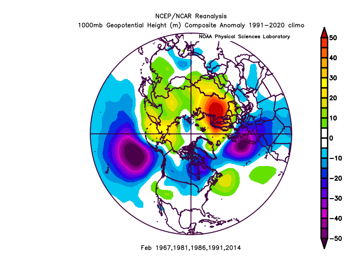 Afgelopen januari beschouwde ik de QBO-fase en ENSO condities om het verloop van de tweede winterhelft duiding te geven: https://www.weerwoord.be/m/3179489. Hierin beschouwde ik een vijftal winters (1967, 1981, 1986, 1991 en 2014) welke gekenmerkt werden door vergelijkbare QBO en ENSO condities. Deze winters werden alle gekenmerkt door een stabiele en krachtige poolwervel met bovengemiddelde zonale windsnelheden op 10 hPa in de eerste winterhelft, een vrij typisch fenotype voor een seizoen met westelijke QBO. De poolwervel blijft in deze set winters ook sterk tijdens de tweede winterhelft, met als uitzondering van 1981 waar deze vanaf half januari sterk verzwakt maar niet volledig tot een SSW overgaat. Een doorsnede van de luchtdrukverdeling voor de vijf februarimaanden laat een sterk positieve luchtdrukafwijking zien boven Scandinavië en Noordwest Rusland met negatieve luchtdruk afwijkingen op de noordelijke Atlantische oceaan, boven Noord Amerika en de noordelijke Pacific.
