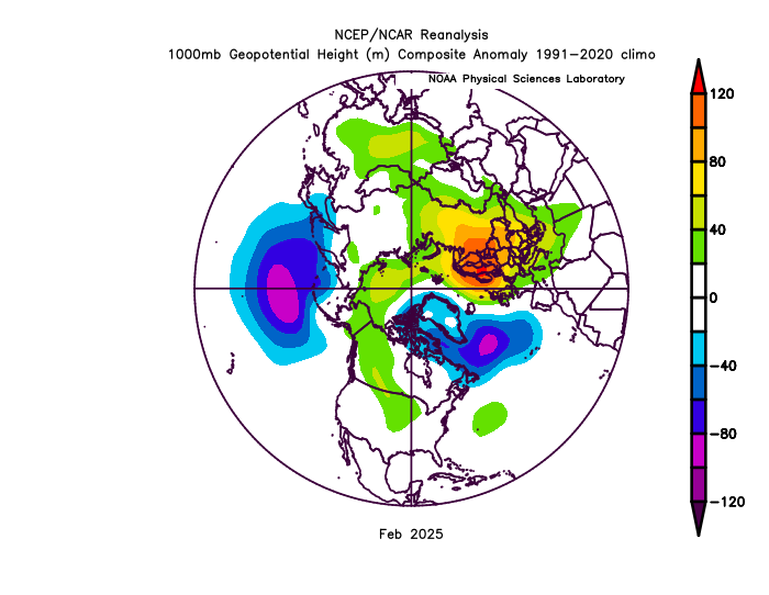 De doorsnede van het noordelijk halfrond voor februari 2025 laat een zeer vergelijkbaar beeld zien, waarbij de sterk positieve afwijking op het Noord Europese continent in het oog springt. Zonder kennis van de voorgeschiedenis zou een dergelijke verdeling zondermeer naar winter smaken. Echter, waar de afgelopen maand weliswaar kouder was dan menig recente februarimaand valt het gebrek aan ijsdagen en duidelijke koudeproductie (Hellmann) zondermeer op. In dit perspectief lijkt februari 1981 redelijke analoog, die maand startte aanvankelijk koud maar kende ook een gebrek aan koude op het continent. In tegenstelling tot 2025 sloot 1981 echter wel koud af dankzij het persistente continentale stromingspatroon, waarschijnlijk geholpen door de eerder genoemde verstoring van de poolwervel. Ondanks het gebrek aan koudeproductie zien we dit jaar echter wel duidelijk dezelfde luchtdrukafwijkingen terug die typerend zijn voor de analoge set winters. Dit biedt perspectief en leert ons wellicht dat in een opwarmend klimaat dominante teleconnecties nog steeds dezelfde patronen in de hand kunnen werken. Analogie op basis van de QBO en ENSO kan hierbij van geval tot geval worden gebruikt om duiding te geven aan ensemble verwachtingen.