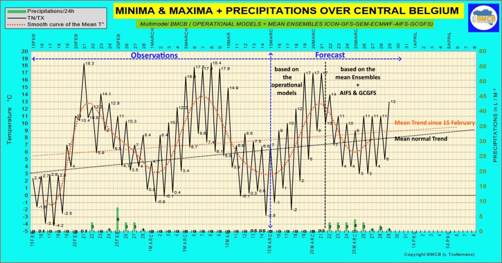 De temperaturen op 2m hoogte en in beschutte omstandigheden, die momenteel ruim onder de seizoensnormen liggen, zullen tussen 18 en 23 maart ruim boven deze normen uitkomen.