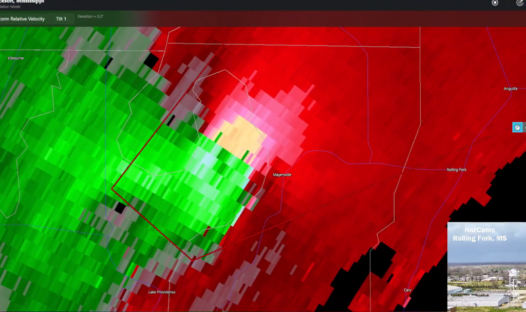 Zo te zien trekt de mogelijke tornado net ten noorden van het dorp Rolling Fork. Gelukkig maar, want ze zijn nog maar net hersteld van de high-end EF4 die daar in 2023 doorheen is getrokken.
