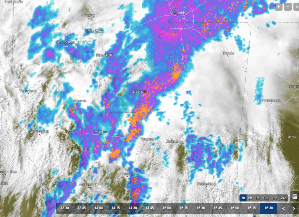 Dat is ten noordwesten van Jackson; daar komt dan ook nog eens een fors onweer bij.