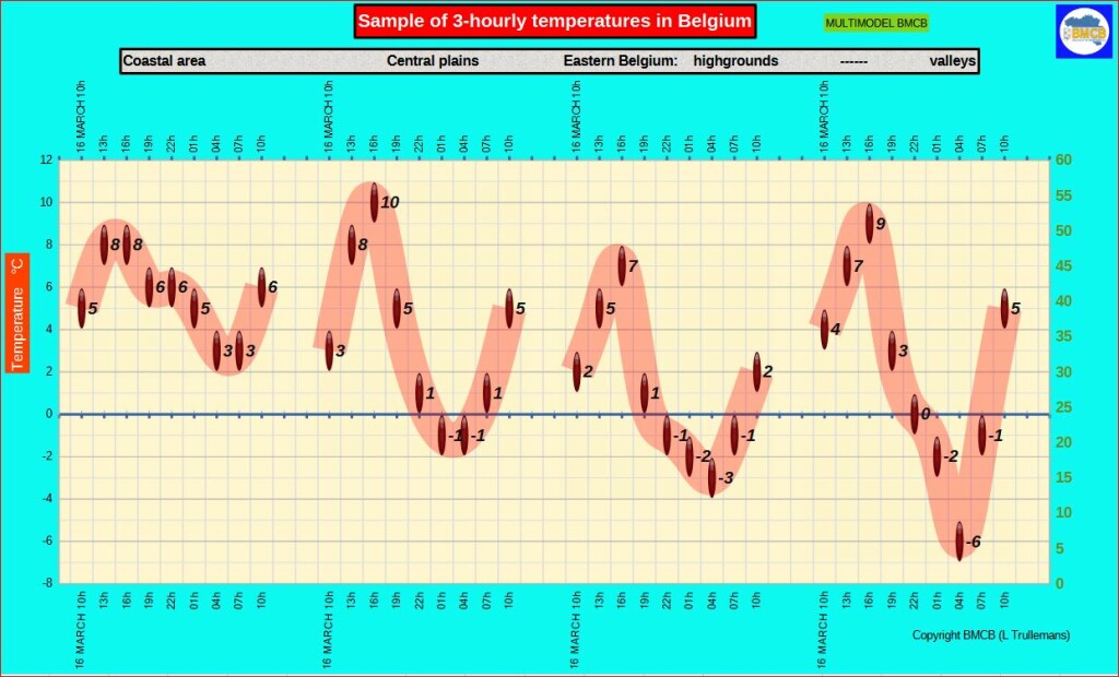 Minimale temperaturen: 4-7° aan de kust, +3 tot -1° in het binnenland en -1 tot -6° in de valleien in het oosten