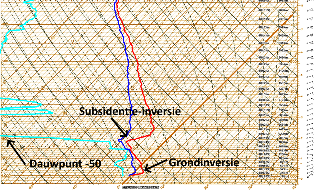 Strenge vorst dus op diverse plekken in de Noord-Hollandse duinen, zo meldt Reinout op zijn website. Dubbele inversie goed zichtbaar op de sounding van De Bilt van afgelopen nacht. Dauwpunt door langdurige subsidentie op 3km hoogte gedaald tot -bijna 50! ![]()