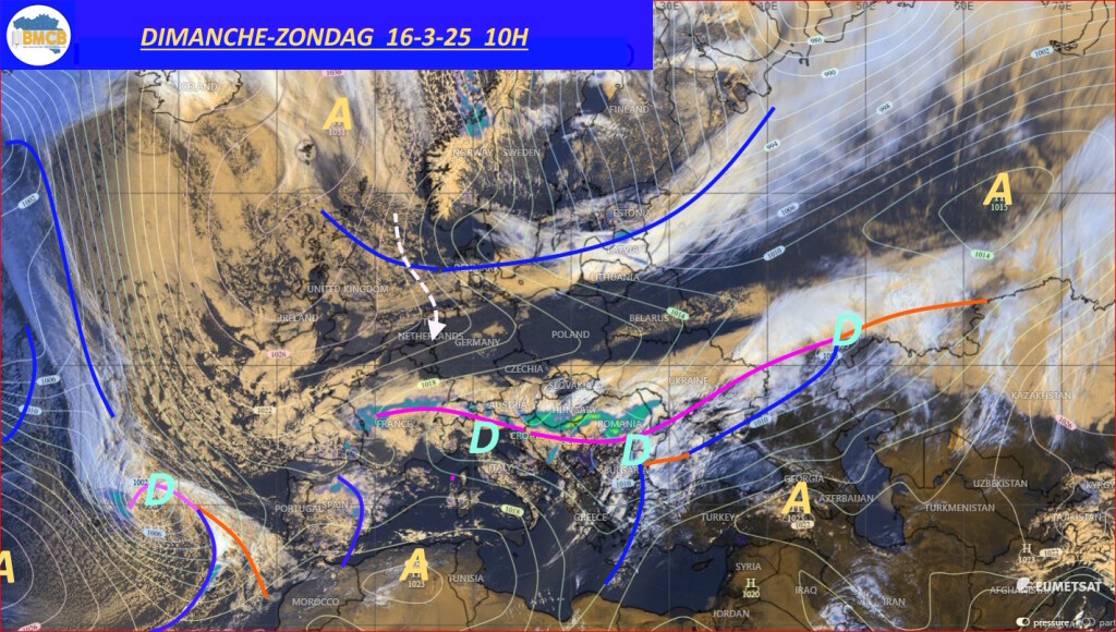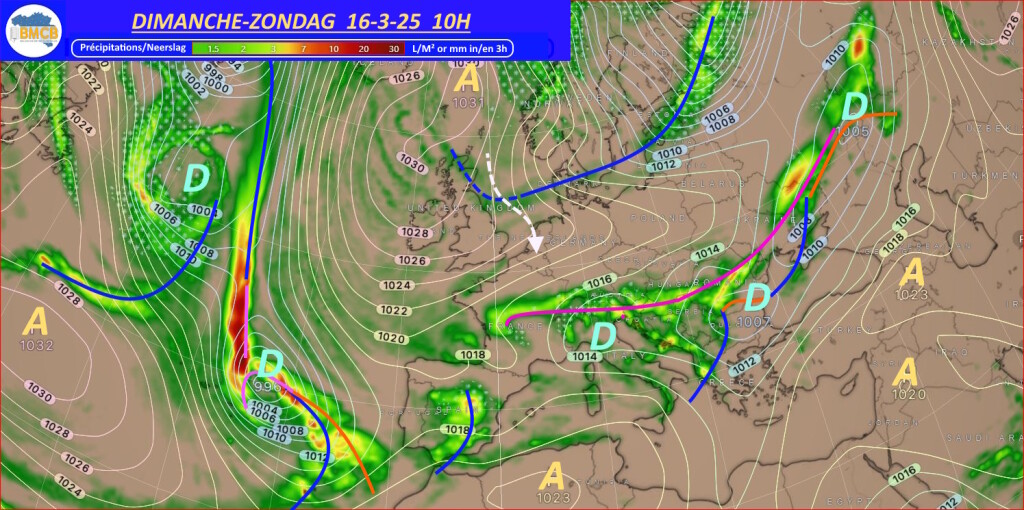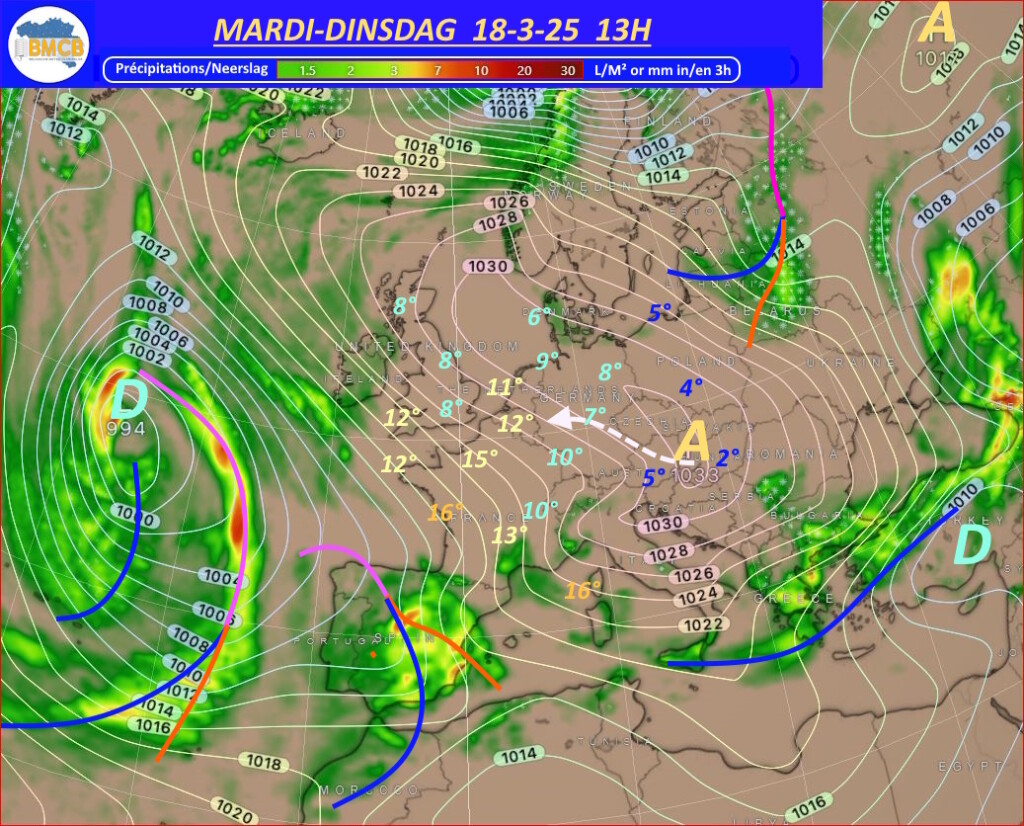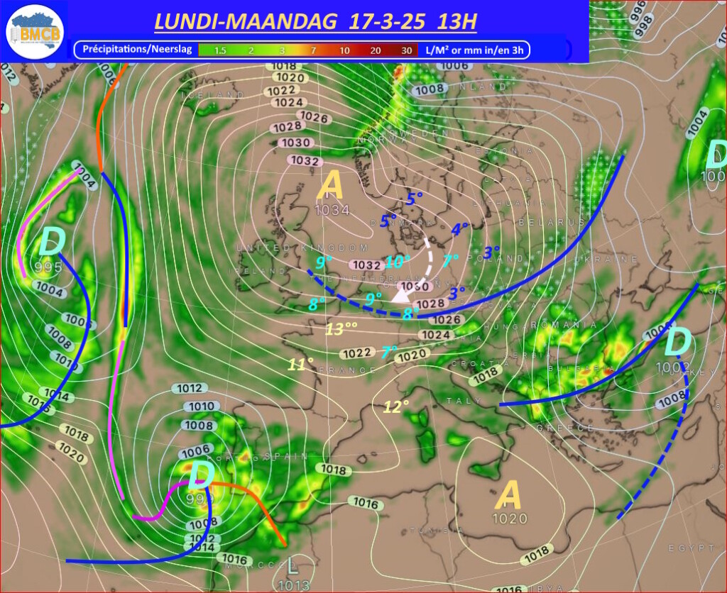 Un anticyclone se déplace vers le sud entre l'Islande et la Norvège et sera centré lundi midi en mer du Nord (1034 hPa), maintenant temporairement un flux frais de nord-est sur le Bénélux. Un faible front froid, accompagné de nuages mais peu de précipitations, quittera la région lundi soir.
