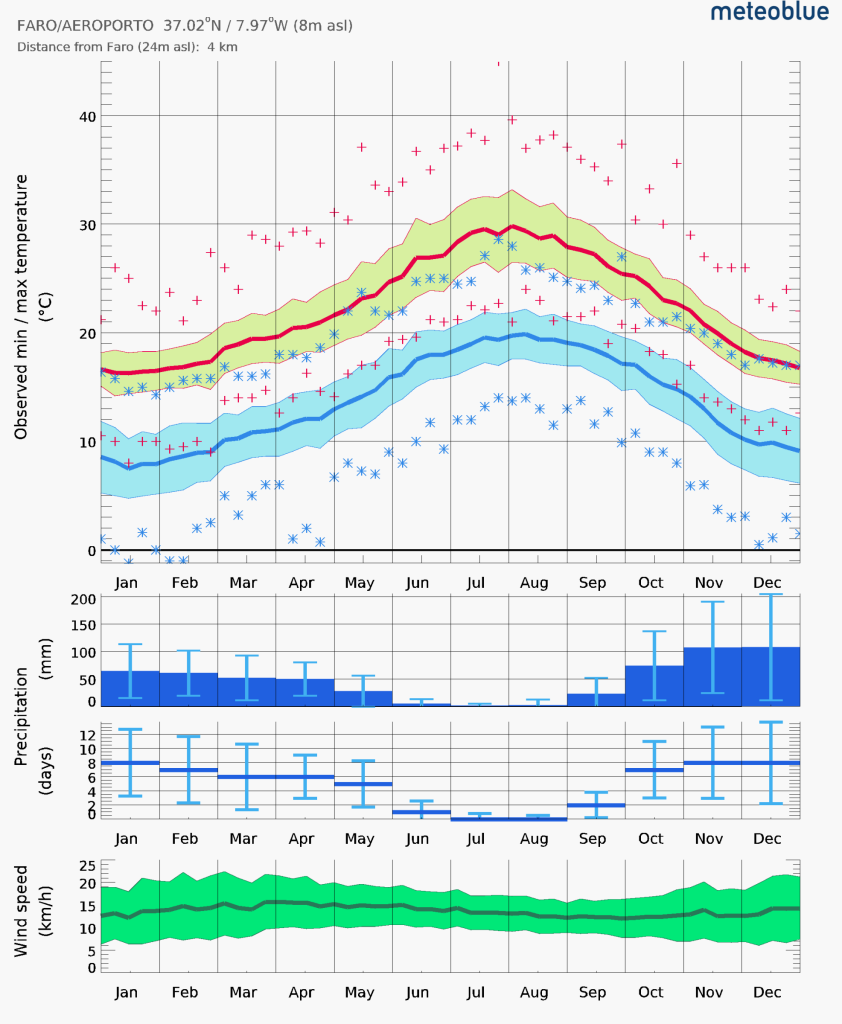 Maart zit een beetje tussen het echt natte seizoen (einde herfst, begin winter) en het echt droge seizoen (einde lente, zomer) in. Hier een voorbeeld voor Faro.