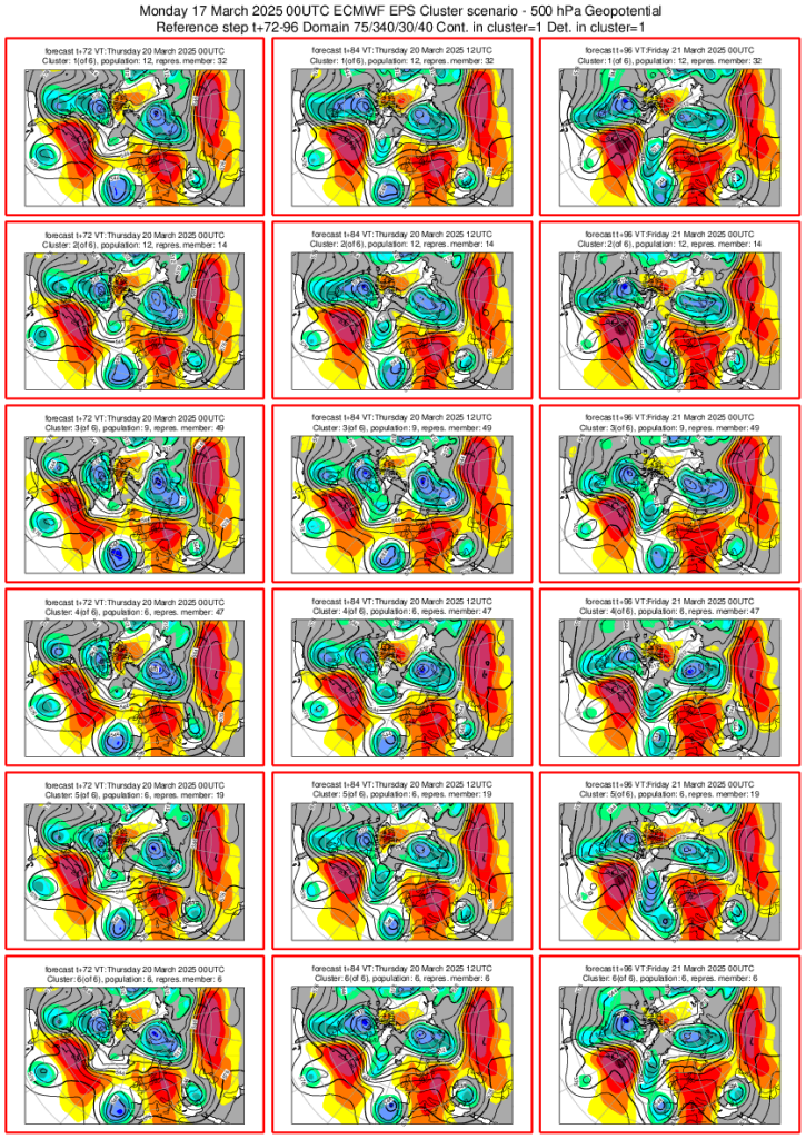 Alle clusters in deze groep tonen een eenduidige setting. Er zitten verschillen in natuurlijk, daarom het de ECMWF-computer er ook 6 verschillende clusters uit gedestilleerd. Naar het zich hier laat aanzien een erg stabiele setting. Het grote aantal clusters zegt niet veel over de onzekerheid geeft het ECMWF aan in de documentatie. Zoals hier te zien is wordt er op basis van héél kleine verschillen geclusterd.