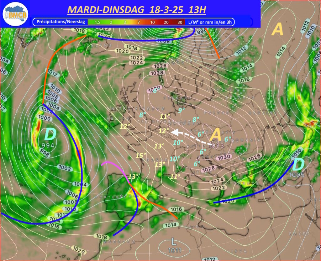 Een hogedrukgebied (1035 hPa), gecentreerd boven de Noordzee, verplaatst zich naar Centraal-Europa en brengt een drogere en minder koude oostelijke stroming over West-Europa.