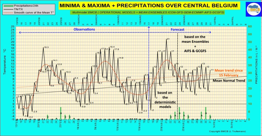 De temperaturen op 2m hoogte en onder beschutting zullen flink stijgen boven de seizoensnormen, met een maximum rond 21 maart.