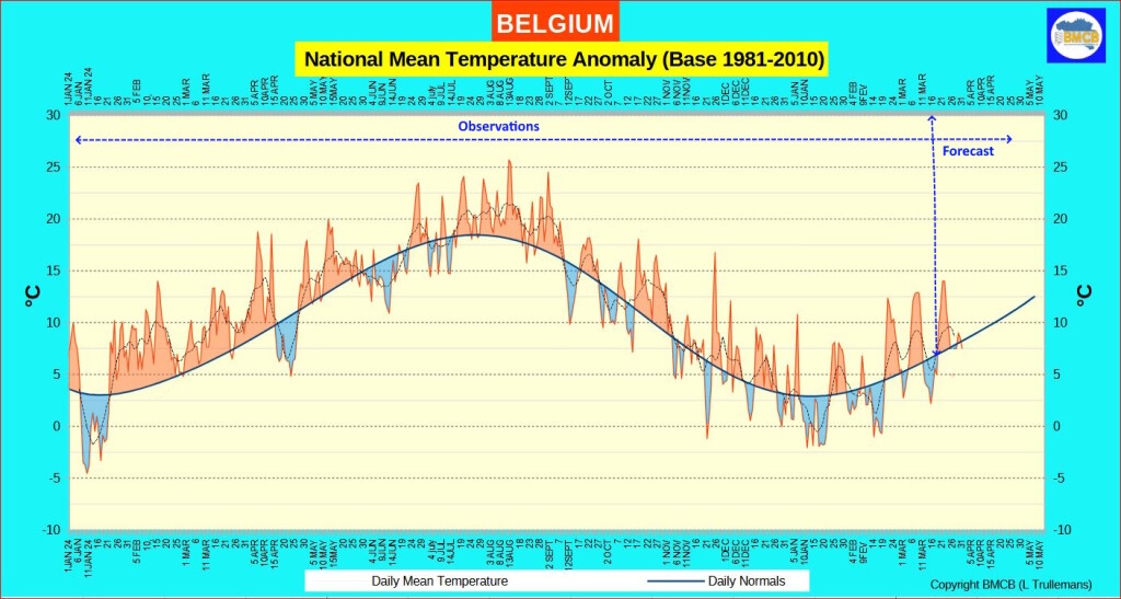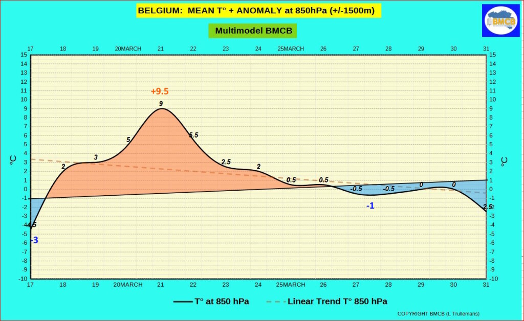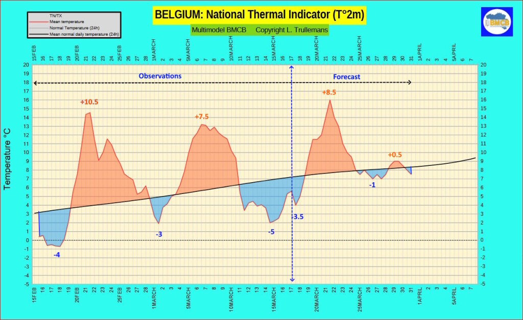 De nationale thermische indicator op 2m, die momenteel tussen -4 en -3 ligt, zal geleidelijk stijgen en weer positieve waarden bereiken, met een maximum rond +8/+9 op 21-22 maart.