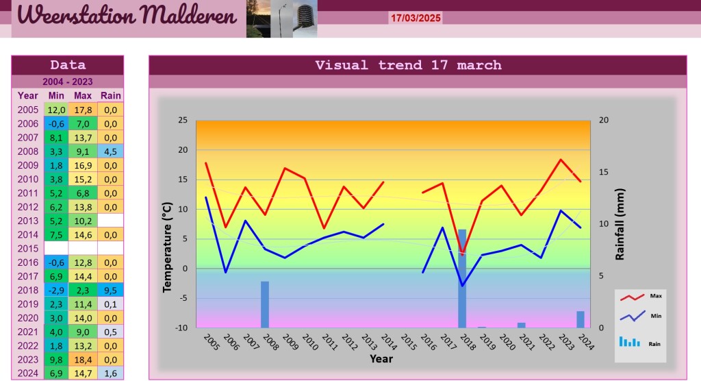 Na het optrekken van de nevel- en mistbanken die zich bij ochtendtemperaturen van 1,8 graden hebben gevormd, werd het opnieuw een mooie lentedag. Net als gisteren was het zonnige weer echter niet voor iedereen weggelegd. Vanuit het noorden is namelijk een koufront komen afzakken dat volgens de satellietbeelden vooral in het midden van Nederland behoorlijk wat bewolking heeft veroorzaakt. Achter het front zat koele en heldere landlucht, waardoor men in het noorden kon genieten van mooie, diepblauwe luchten. Malderen bevond zich nog in de zachte lucht ten zuiden ervan, wat zich vertaalde in een erg nevelig en flets weerbeeld. Ondanks de schaarse bewolking (enkel wat Cirrus) en de bijna ononderbroken zonneschijn, had het Malderse luchtruim een oranjewitte kleur. Later ontwikkelden er zich stapelwolkjes en dreef er wat Altocumulus voorbij, maar in de nevelige atmosfeer leken ze eerder op grijze schimmen die zich langzaam voortbewogen in het bizar gekleurde luchtruim. De temperatuur kon in deze omstandigheden nog naar 16,9 graden stijgen, terwijl er een noordoostelijk briesje tot 17,7 km/h stond. Tijdens de avond voelde het al snel koud aan, maar waarschijnlijk was dit eerder een gevolg van de uitdrogende landlucht die ons bereikte, aangezien het nog tot geruime tijd na zonsondergang boven de tien graden bleef. Het arriveren van de heldere lucht was later op de avond goed merkbaar aan de maan en sterren die geleidelijk feller gingen schijnen, en hierbij verkleurden van geelachtig naar zilverwit. Af en toe doken ze weg achter Stratus fractus die met een redelijke snelheid voorbijdreef, maar dit had geen verdere gevolgen zodat het neerslagtotaal beperkt bleef tot 0,0 mm.
