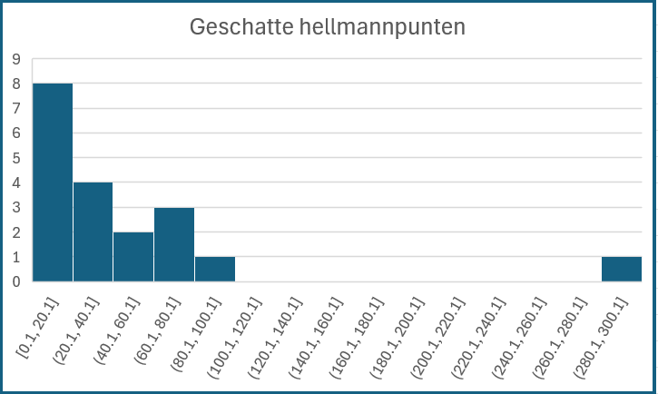 Grafiek: aantal geschatte hellmannpunten per interval uitgezet tegen het aantal personen van wie de schatting in het desbetreffende interval kan worden geplaatst.