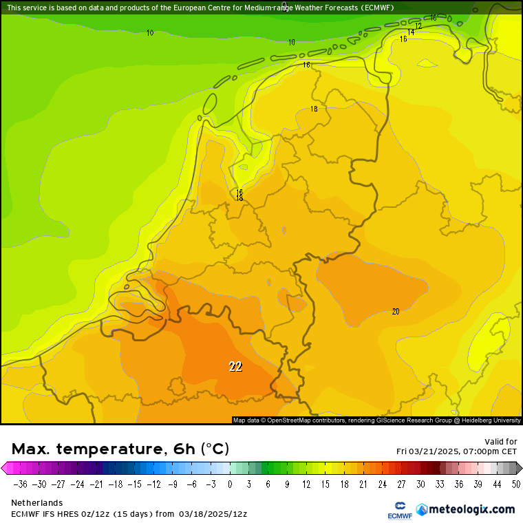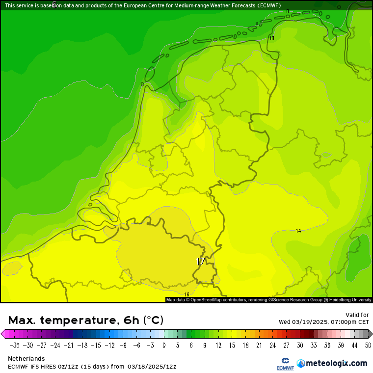 Voor morgen komt de ruwe uitvoer van ECMWF met 12 - 17 graden (14 - 19?) en voor vrijdag met 17 - 22 graden (19 - 24 graden?).