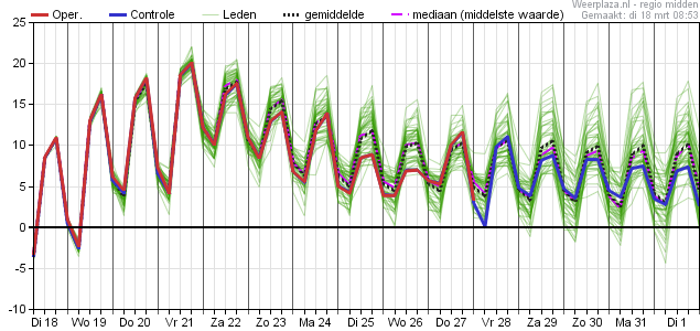 Als ik het goed zie kwam die voor Harderwijk met een Tx van 10,5°C tot 11°C en dat zat behoorlijk in de buurt. Dan zou je zeggen dat de komende dagen de Tx toch ook nipt hoger uitvalt dan in deze pluim te zien is