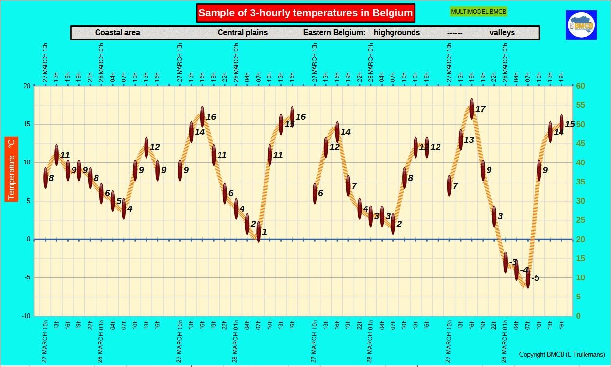 Températures minimales : entre +6 et +8° au littoral , entre 0 et +5° dans l'intérieur du pays, mais entre +0 et -5° dans les vallées au sud du sillon Sambre et Meuse