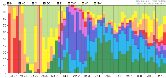 Ten opzichte van de voorgaande runs nog wat verder opgewarmd voor de eerste dagen van april, met opnieuw een mogelijkheid voor 20(+) graden rond donderdag. Met een veelal aflandige wind zou dat op veel plekken mogelijk moeten zijn, ook in de meeste kustgebieden. Daarbij uiteraard droog en veel zonneschijn. De nachten blijven door het heldere weer wel fris. Richting volgend weekend dan wel een stevig signaal voor een duidelijke afkoeling, zeker op zo'n termijn. Het gemiddelde gaat dan terug naar iets boven de 10 graden, wat lager is dan het langjarig gemiddelde (12.5 graden voor 1e decade april). De wisselvalligheid zou dan ook iets toe kunnen nemen, maar dat is nog erg ver weg en heel overtuigend zijn de neerslagsommen ook (nog) niet. Al met al lijkt april verder te gaan met het weer wat we in maart hebben gehad: droog, veel zonneschijn en wisselende temperaturen (overdag veelal bovengemiddeld, 's nachts juist onder het gemiddelde).