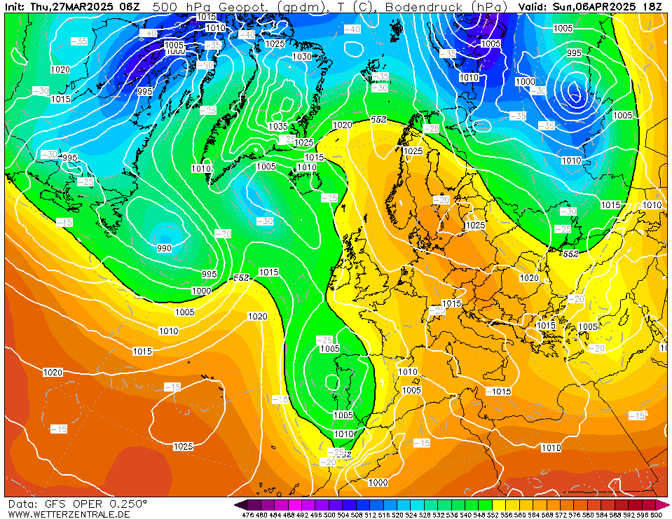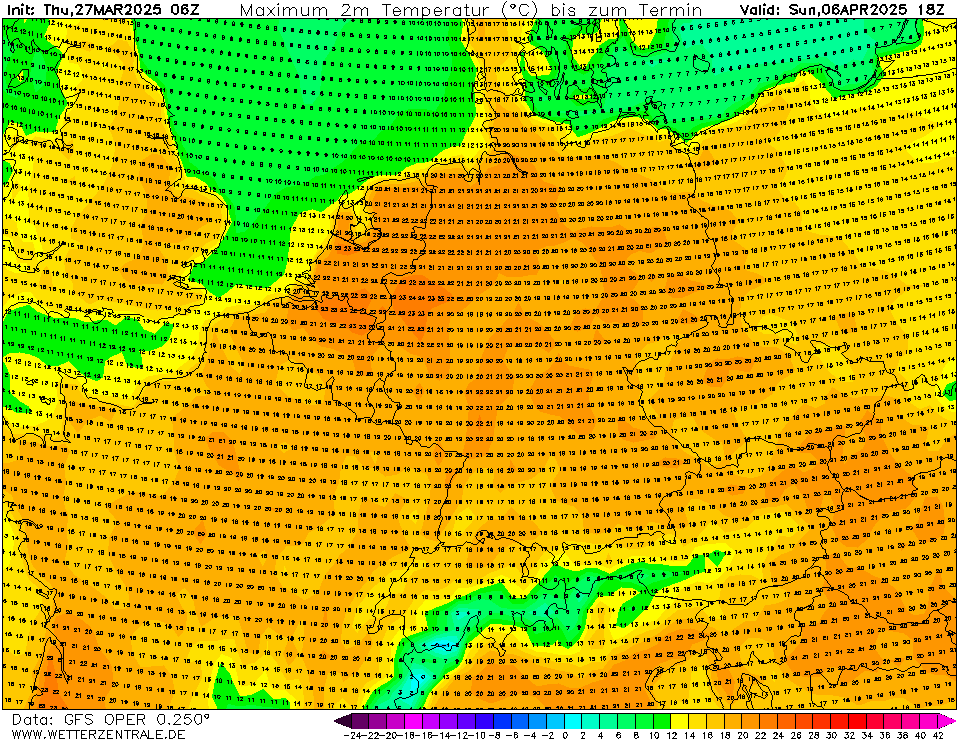 Met langdurigere warmte doordat het hoog zich op een andere plaats positioneert. Wij blijven met oostenwind zitten en dat betekent in deze tijd van het jaar vaak warm weer. Vooral wanneer april op de kalender verschijnt. Prachtige run. Mag wel wat groeizaam nachtonweer bij maar dat wordt lastig met zo'n setting. Hieronder de kaart voor zondag over week week. Stan's verjaardag, dan moet het wel gaan lukken toch?