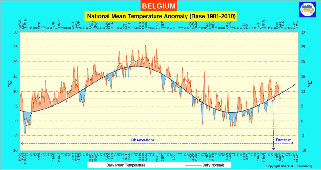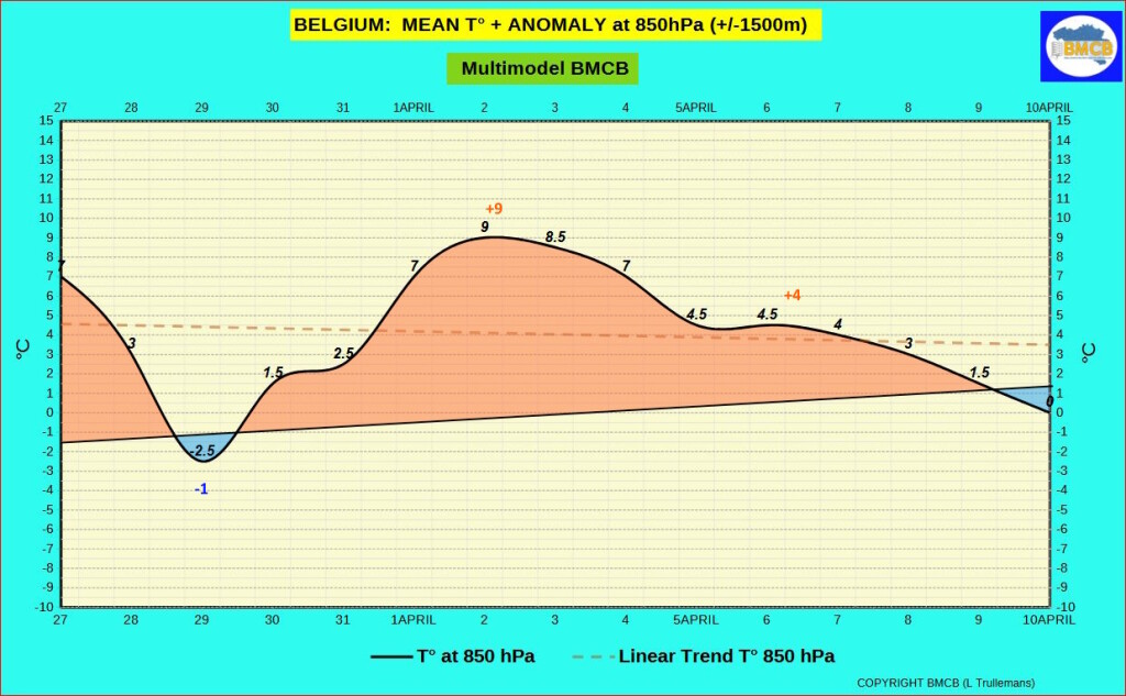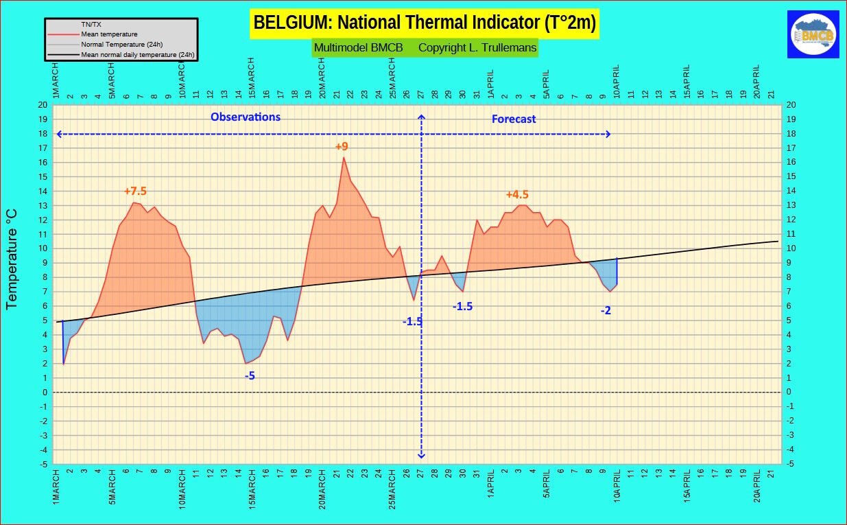 Au cours des prochains jours, l'indicateur thermique national à 2 mètres oscillera autour des normales, avec des écarts compris entre +2°C et -2°C. Mais à partir du 31 mars, une hausse sensible est attendue : cet indicateur se stabilisera alors entre +2°C et +5°C au-dessus des moyennes saisonnières jusqu'au 6 avril.