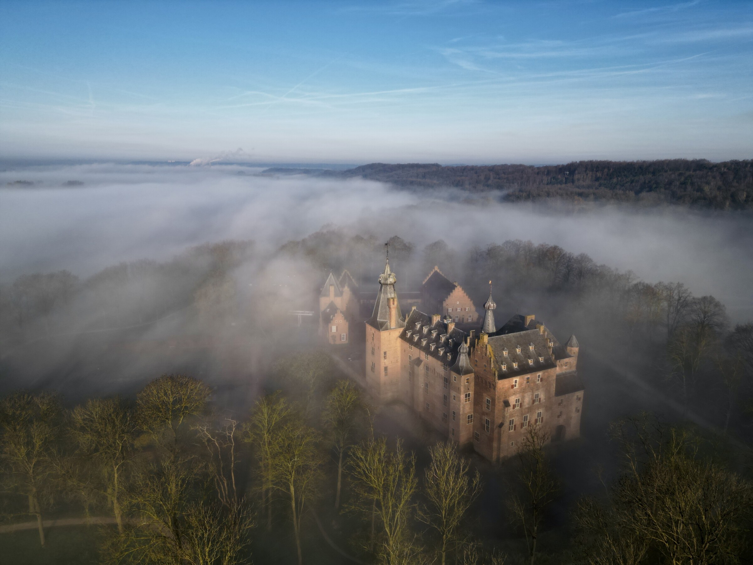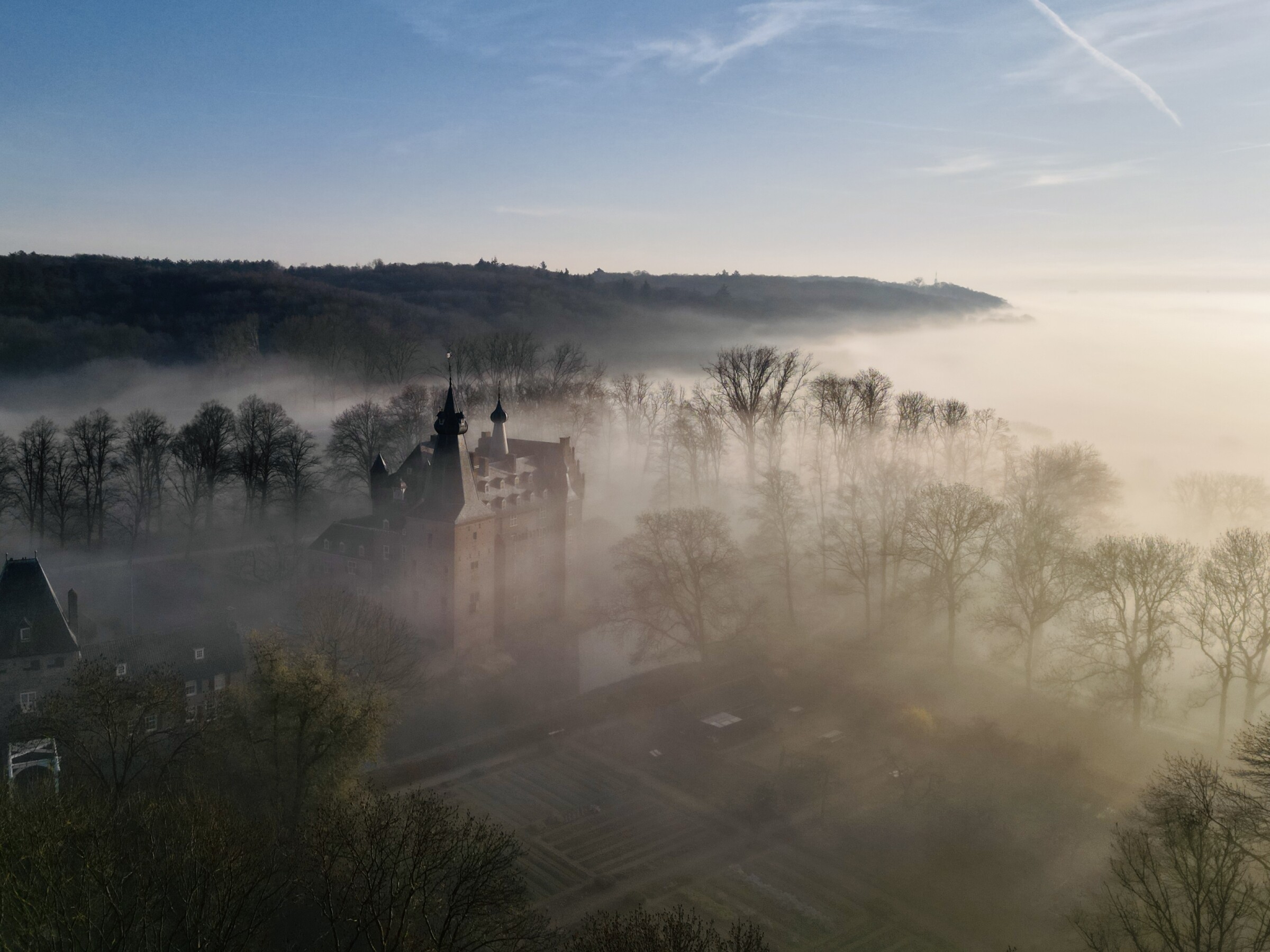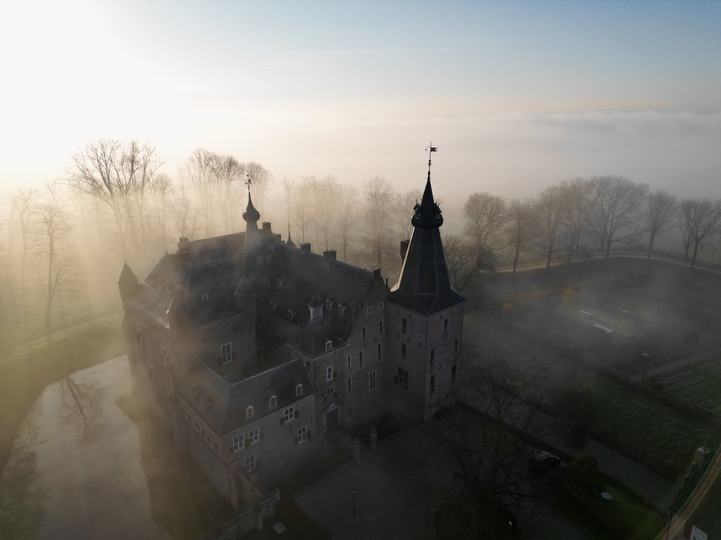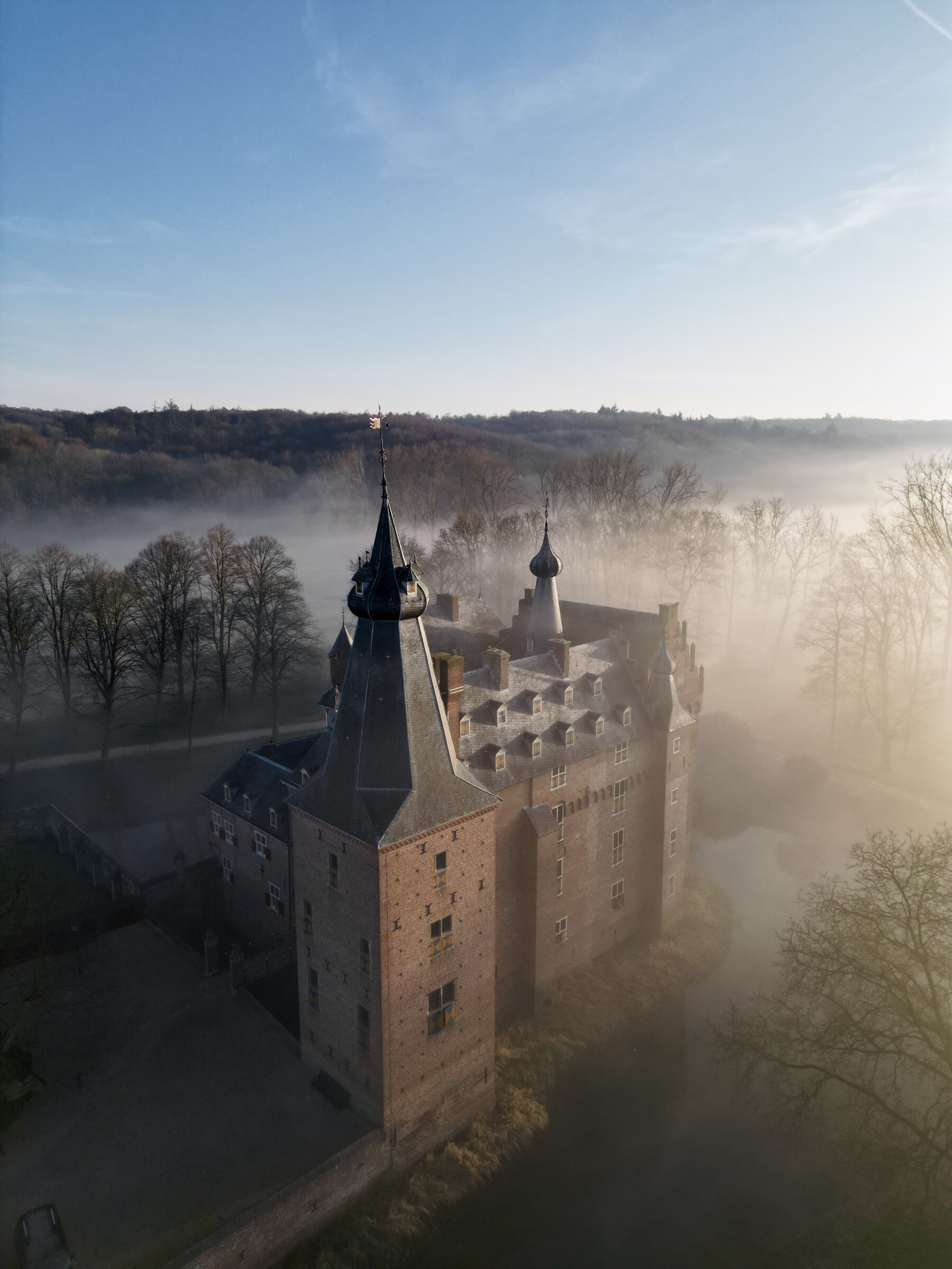 Hier zijn enkele dronefoto’s van het kasteel, de eerste 2 foto’s heb ik onderweg gemaakt. Er waren soms meerdere mistlagen boven elkaar te zien.