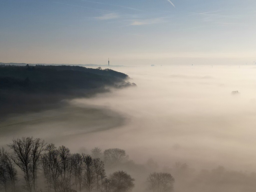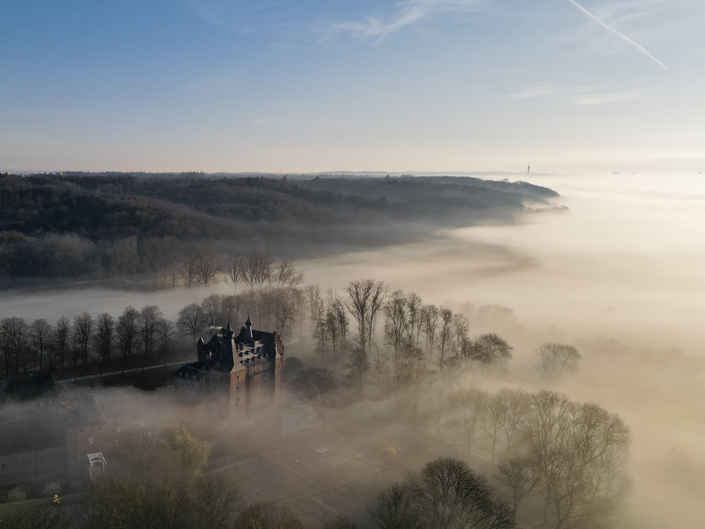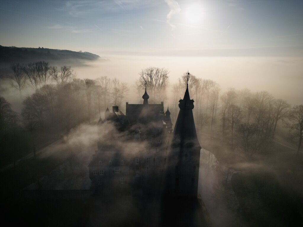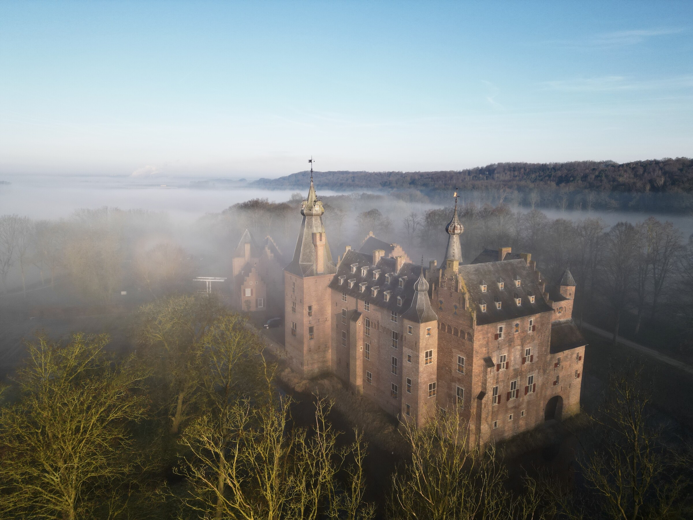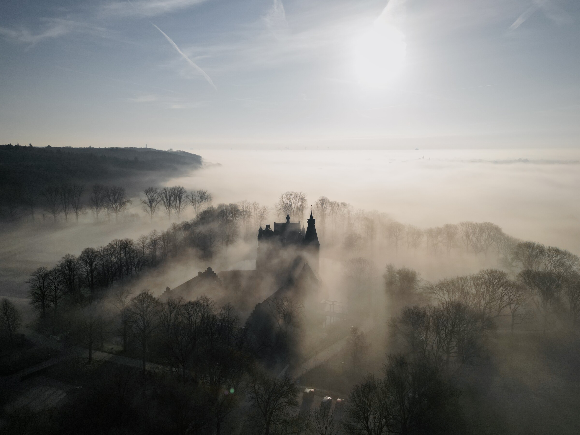 Hier zijn enkele dronefoto’s van het kasteel, de eerste 2 foto’s heb ik onderweg gemaakt. Er waren soms meerdere mistlagen boven elkaar te zien.