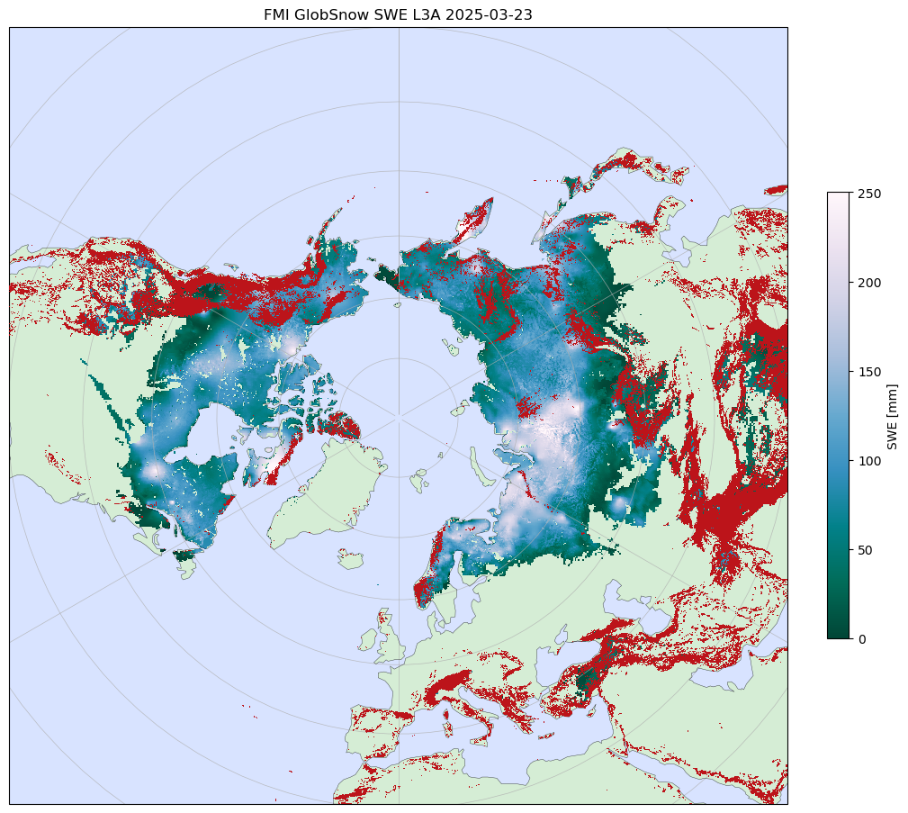 Als ik, naief wellicht, de som daarvan neem kom ik ongeveer 30% lager uit dan de getoonde grafiek. Maar wellicht past die grafiek nog een soort correctie toe voor de ontbrekende gebieden, zoals bergen (rood op de onderstaande kaart). Grote eilanden als Groenland worden in de data als water gegeven, dus zonder sneeuw hoeveelheid.