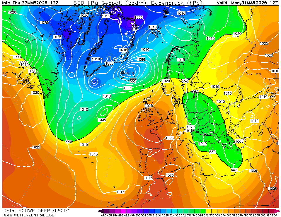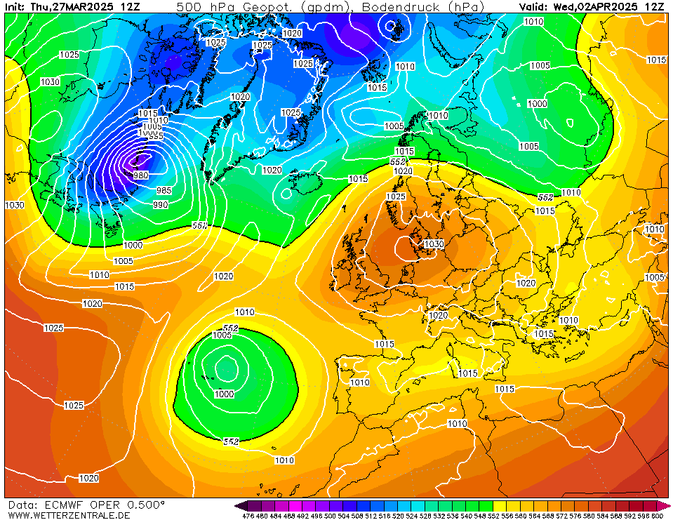 Vanaf donderdag drukstijgingen boven IJsland. Dit hogedrukgebied lijkt het sturende hoog te gaan worden