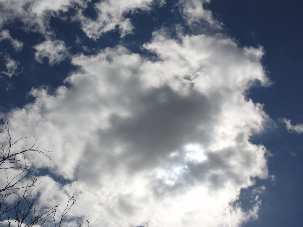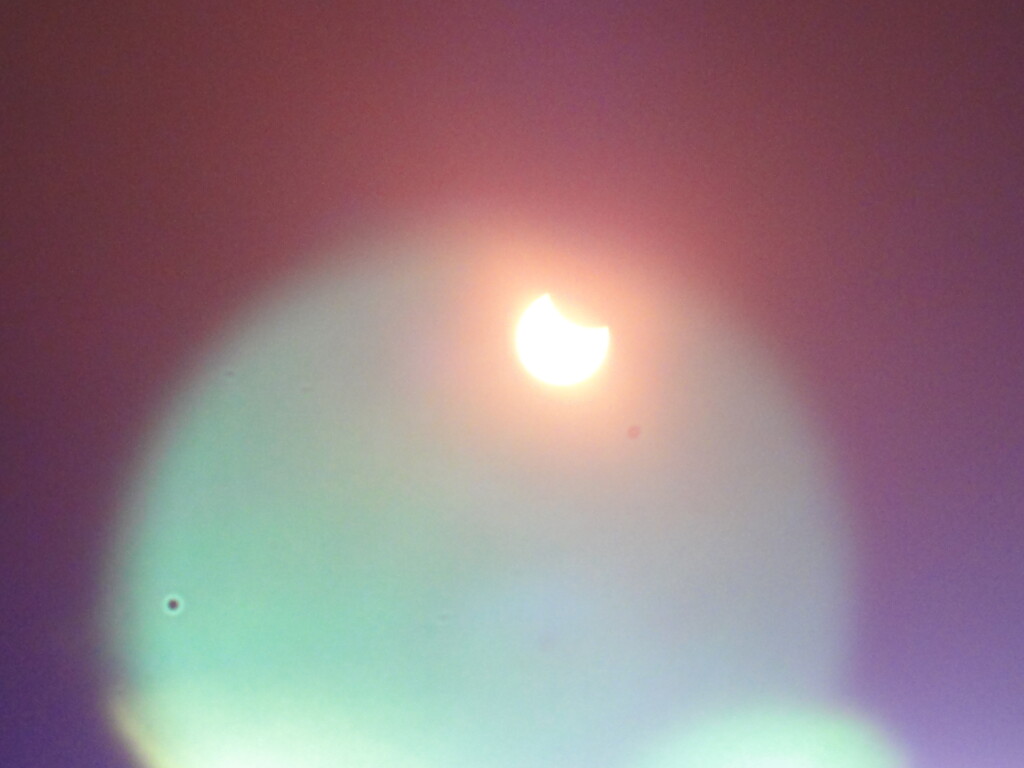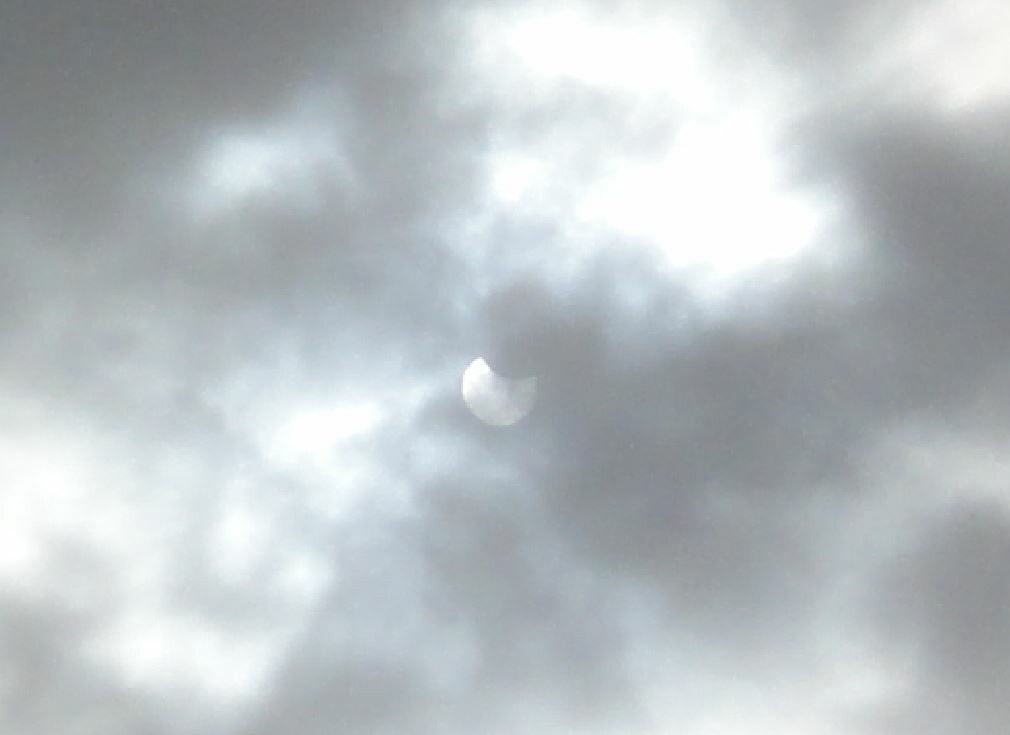 De eerste foto is ingezoomd door een eclipsbrilletje genomen. De tweede zonder eclipsbril en de derde is een uitvergroting van de tweede foto. Het merendeel van de foto's zijn mislukt omdat ze overbelicht zijn en/of onscherp. Ik heb een simpele camera en geen speciale apparatuur.