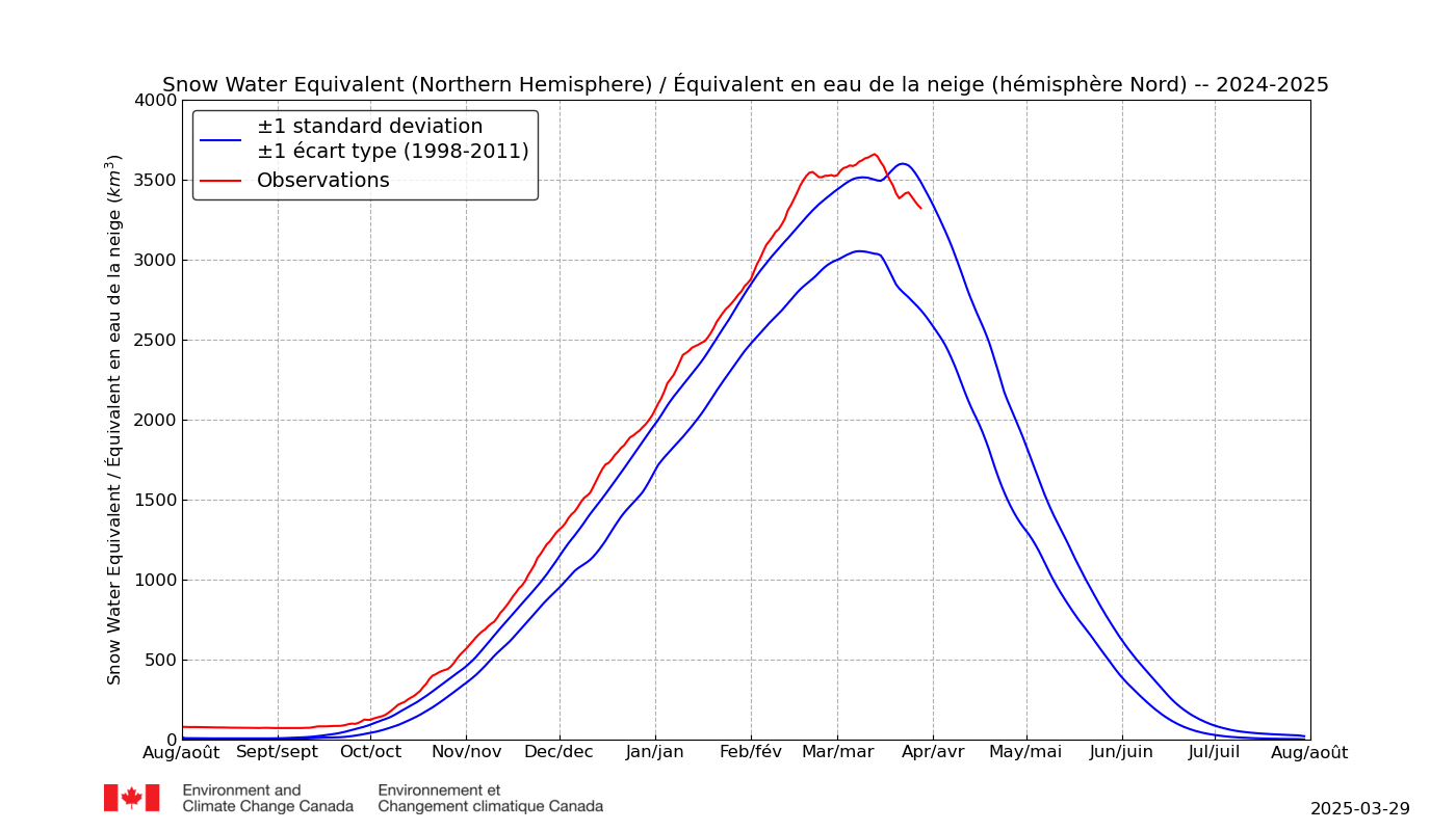 Daarbij zijn ook Canadese gegevens van het 'Snow Water Equivalent', en die zien er toch wel wat anders uit dan de Finse grafiek. Die staat er ook bij vermeld. Hieronder die recente Canadese grafiek: