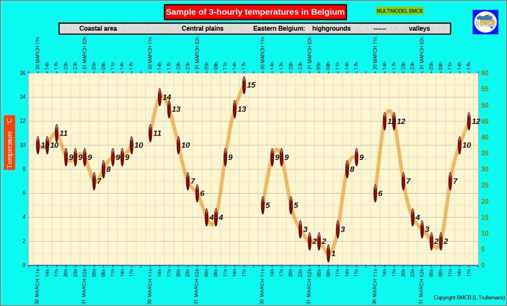 Températures maximales : entre 9 et 12° au littoral et en haute Ardenne, et entre 12 et 14° ailleurs