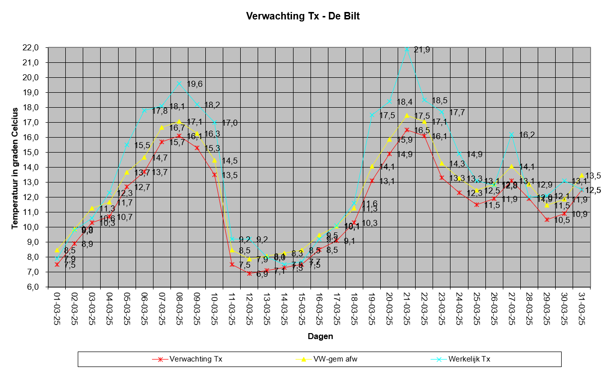 Afwijkingen GFS voor Tx in lente 2025 (maart)