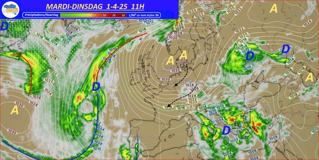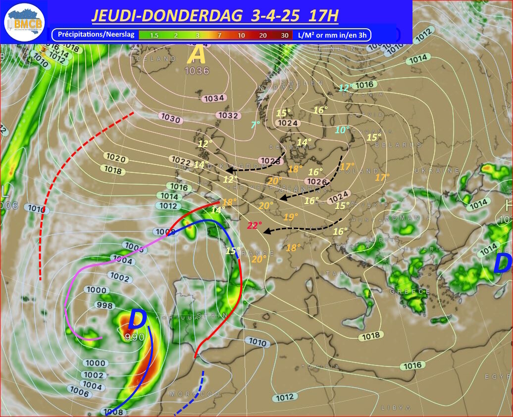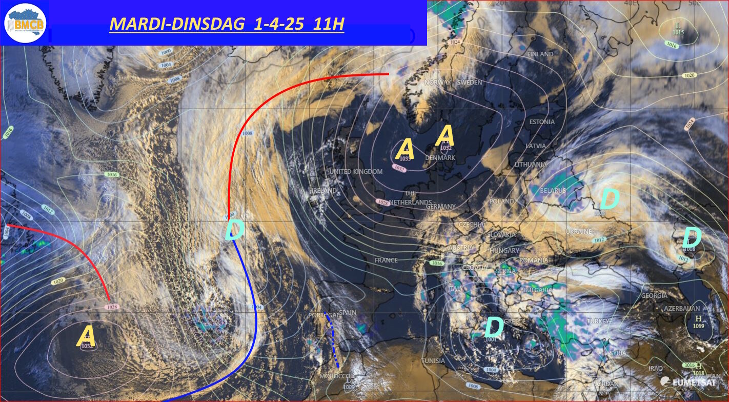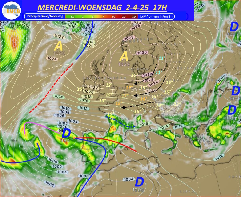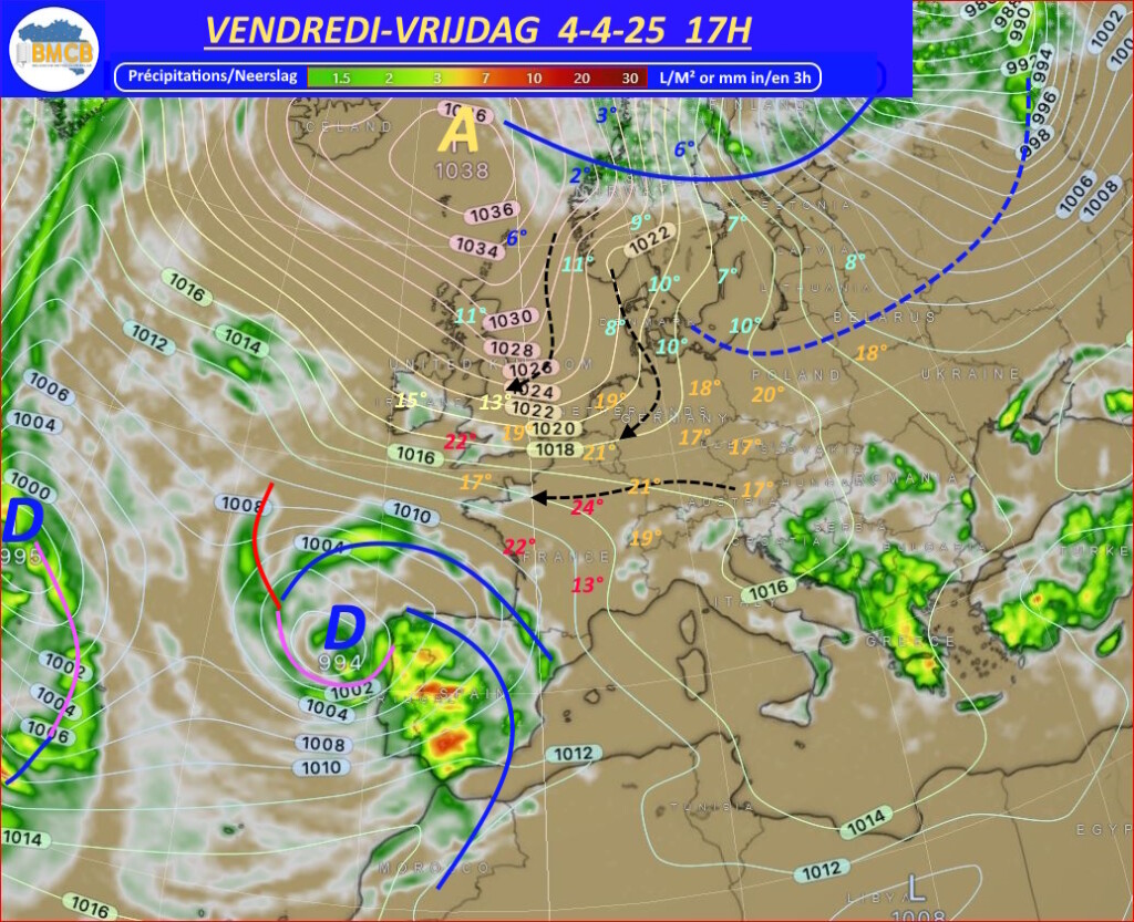 Cependant, sur son flanc est, un air beaucoup plus froid venu des régions polaires plongera vers la Scandinavie avant d'être poussé par des vents de nord-est vers nos régions au cours du week-end, y provoquant une nette baisse des températures.