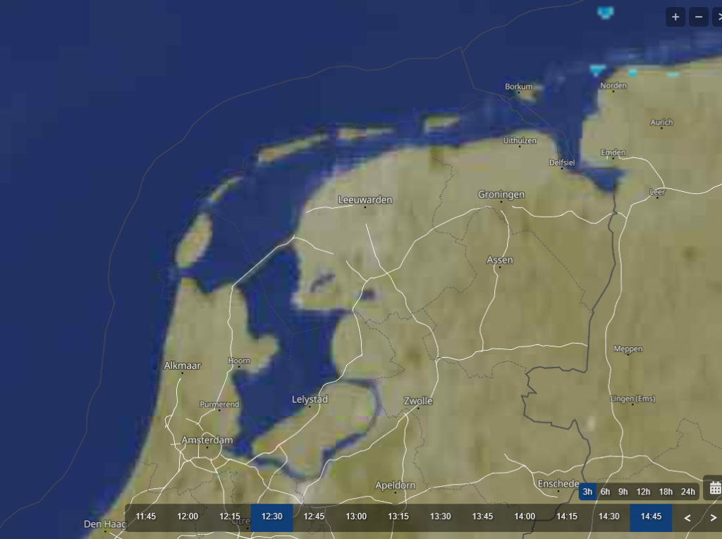 Geen dank. Ik ben nu weer thuis en heb het nog even opgezocht. Hier twee beelden, van 12:30 en 13:00. Om 13 uur was de bewolking wat naar het (zuid-)westen getrokken en ook wat verder boven Friesland ontwikkeld. Maar op dit wazige beeld is er nauwelijks enige structuur te zien. Misschien heeft Koos nog een scherper beeld, maar dat moet dan net wel van die tijd zijn. Meestal is dat iets eerder bij die satelliet.