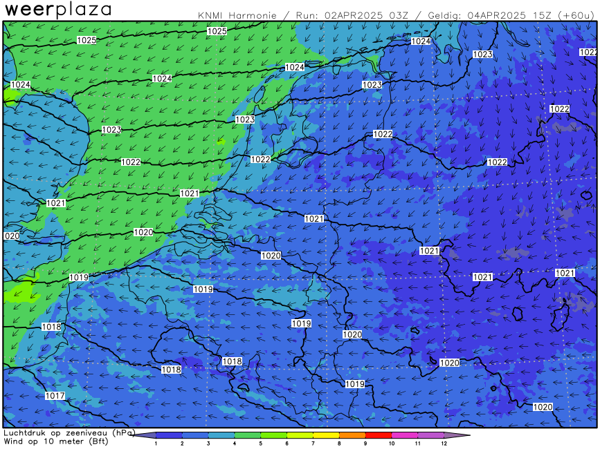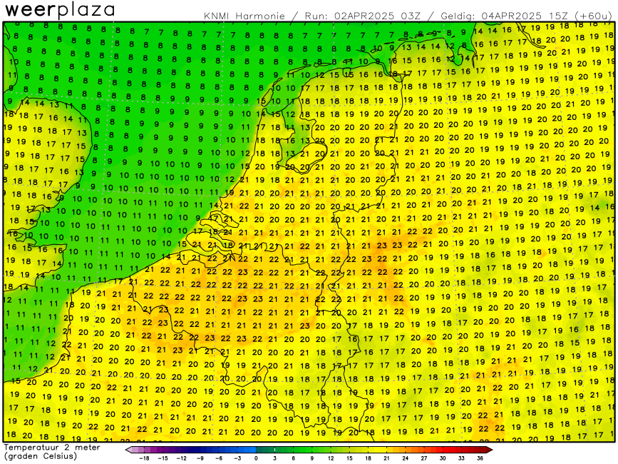 Een zwakke tot hooguit matige noordoostenwind, stralend zonnig en m.u.v. het noorden en de Ardennen op veel plaatsen 20 - 22 graden. Twee weken eerder (21 maart) natuurlijk ook al zeer hoge temperaturen, maar toen wel meer (hoge) bewolking en een stevige oostenwind.