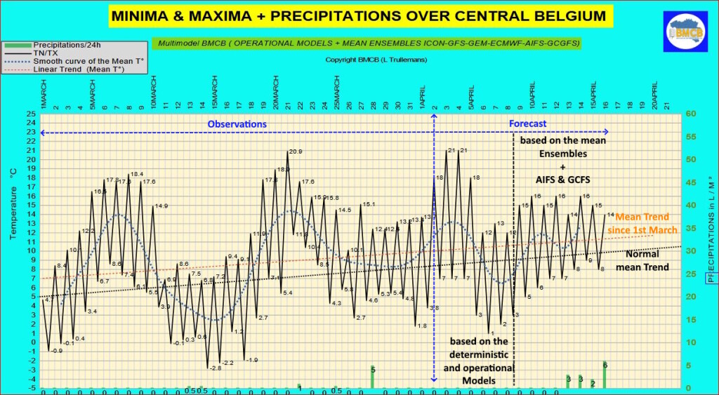 De temperaturen, gemeten op 2 meter onder een weerhut, zullen over het algemeen stijgen tot boven de seizoensnormen maar zullen tussen 5 en 8 april er opnieuw onder dalen.