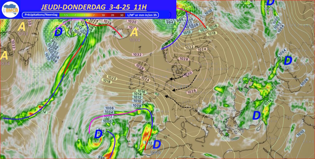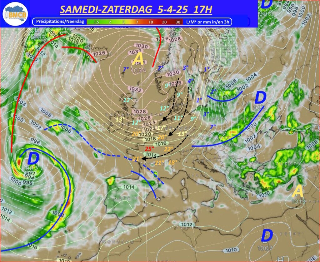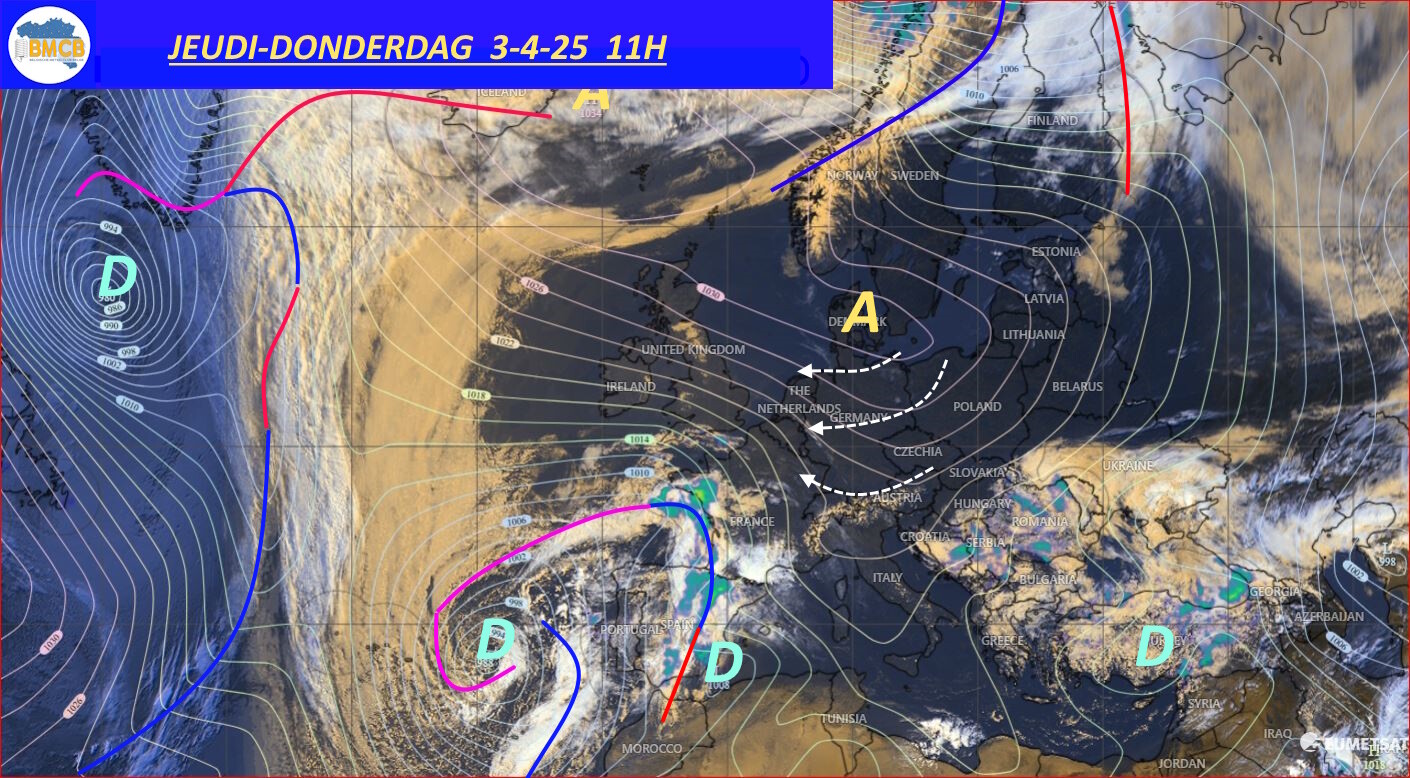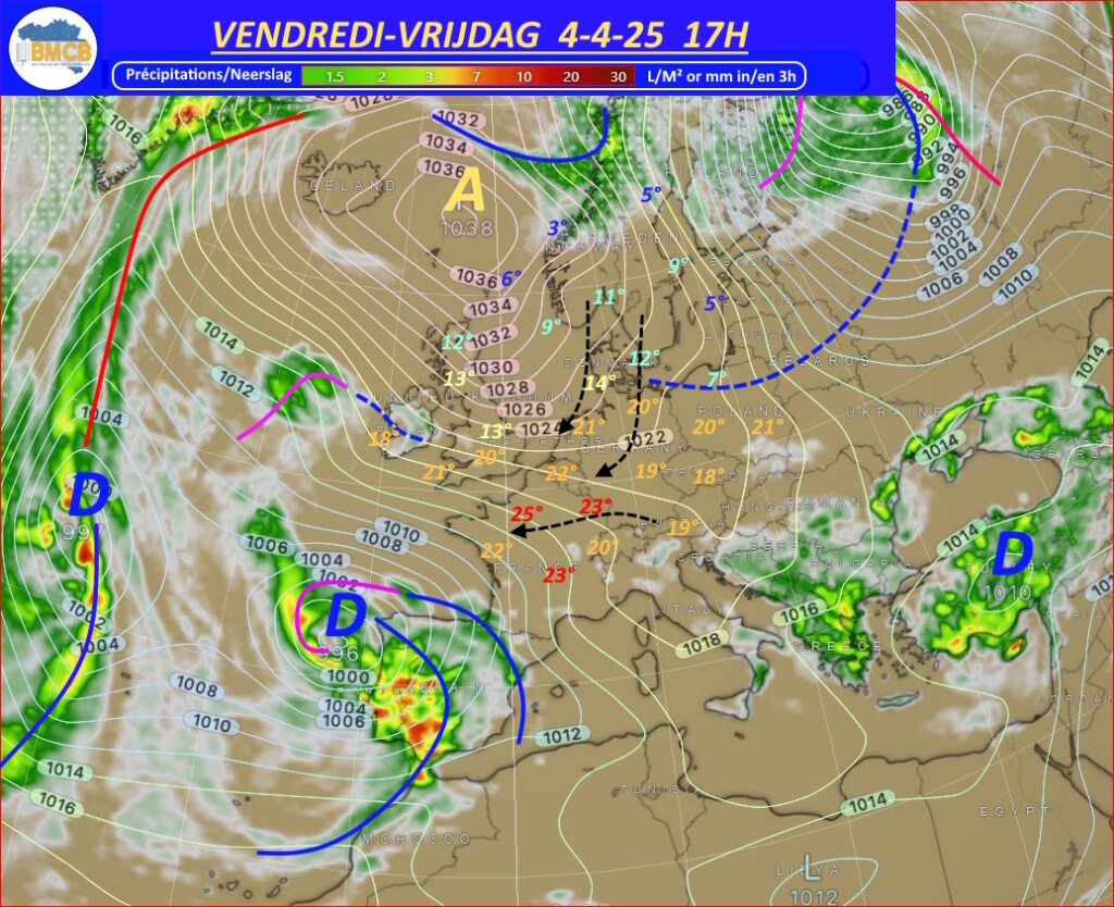 Le puissant anticyclone de 1038 hPa, centré vendredi après-midi près des îles Féroé, prolongera jusqu'au début du week-end un flux continental d'est à nord-est, à la fois très sec et très doux sur le Benelux.