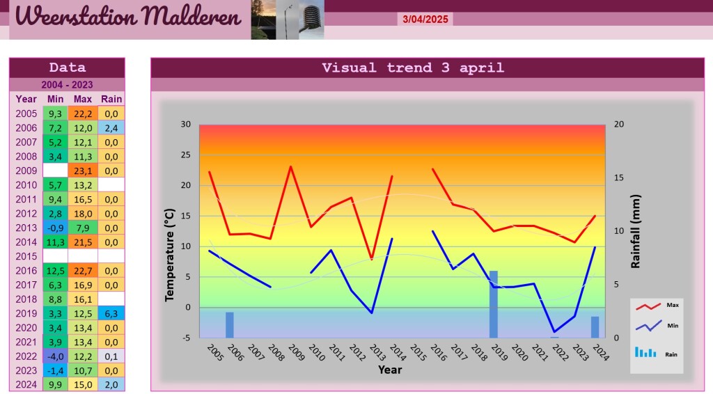 We begonnen de dag in lichtbewolkte omstandigheden en bij minima van 2,8 graden. De Altocumuluswolken hebben kennelijk plaats gemaakt voor Cirrus en Cirrostratus maar ook deze hadden weinig invloed op het vriendelijke en zonnige weertype waarmee we van start zijn gegaan. In de loop van de dag werden er stapelwolken gevormd en dreef er wat Stratocumulusbewolking voorbij, wat evenmin invloed had op het zonnige en zachte lenteweer. Dit in tegenstelling tot het noorden van Nederland waar men zich tevreden moest stellen met maxima net boven 5 graden en grijs weer met motregen. In Malderen liep het kwik tijdens de namiddag op tot 18,0 graden en er stond een zachte wind die naar het zuidwesten draaide met 32,2 km/h uit het noord- noordoosten als uitschieter. De warmte bleef tamelijk goed hangen al konden we zeker nog niet van terrasjes- of zwemweer spreken na zonsondergang. Op de radarbeelden zagen we ondertussen hoe onweers - en regengebieden pogingen deden om het land te veroveren, maar dat lukte maar gedeeltelijk en Malderen bleef gespaard zodat we alweer met 0,0 mm konden/moesten afsluiten.