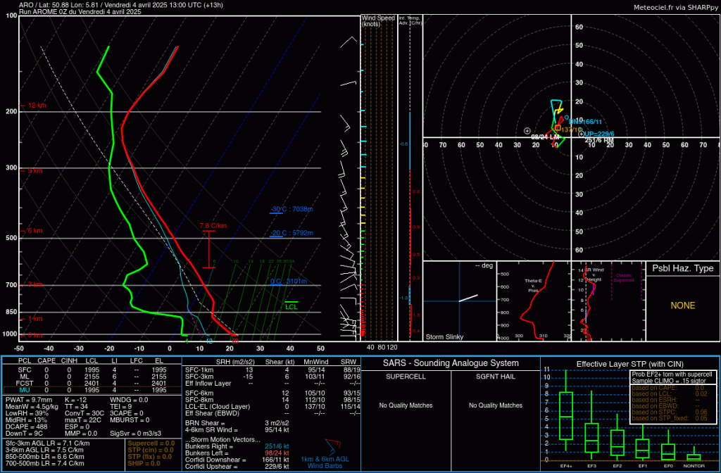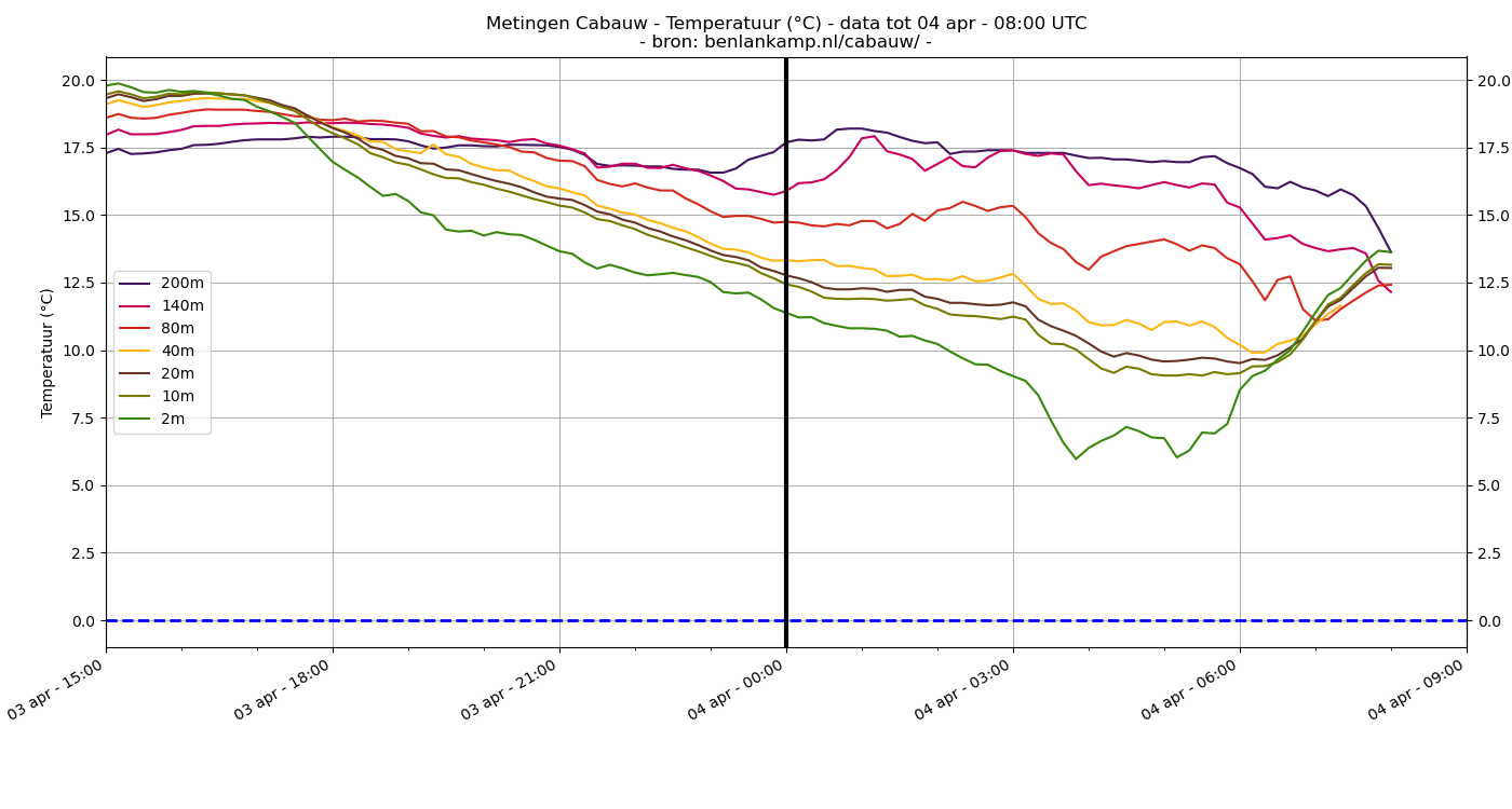 Ik ben zelf niet zo'n fan van gelokaliseerde dagrecords op basis van automatische stations met een kortere meetreeks. Maar het lijkt me in ieder geval wel duidelijk dat er vandaag op grote schaal sprake gaat zijn van een warme dag. De temperatuur op 850 hPa ligt op 8°C á 9°C. Dat zou een ruime warme dag moeten opleveren. De NWP-modellen hebben de neiging om de thermische amplitude ietwat te onderschatten, dus ik ga uit van een lokale 23°C in Noord-Brabant en Limburg als Tmax. Verder op grote schaal temperaturen van 21°C á 22°C. Dat komt dichtbij het landelijke dagrecord van 24.4°C in Eelde op 4 april 1946, maar we zullen het zeer waarschijnlijk niet verbreken. Tevens weer een stabiele dag onder anticyclonale invloeden en een vorticiteitsminimum in de Benelux. Er is dan ook sprake van een stabiel atmosferisch profiel. Het gevolg daarvan is dat er afgelopen nacht op veel plekken sprake was van een stralingsinversie. Door de stralingsinversie daalde de Tmin afgelopen nacht tot regionaal dicht bij het vriespunt. De thermische amplitude (ΔT = Tmax-Tmin) zou hierdoor op diverse plekken rond de 20°C kunnen uitkomen.