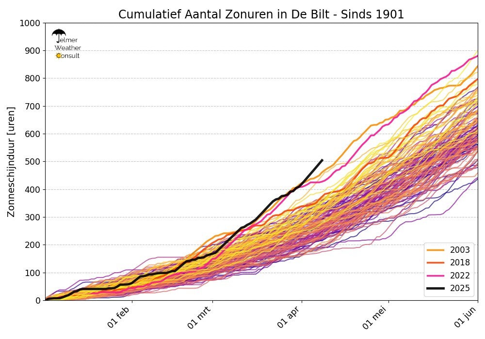 Met afstand het zonnigste jaar ooit gemeten tot nu toe. Met 504 zonuren (t/m 7 april) hebben we ook een behoorlijke ruime voorsprong op 2003 (461 uur), 2002 (448 uur) en 2022 (427 uur). Het verschil met de #5 (2014) is zelfs zo'n 114 uur!