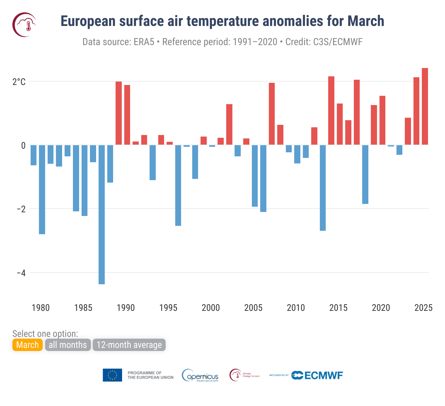 Met een gemiddelde afwijking van +2.4°C t.o.v. het langjarig gemiddelde voor 1991-2020 was het in Europa de warmste maart sinds ten minste 1940. Vooral in Oost-Europa was het extreem warm, licht negatieve temperatuuranomaliën waren alleen op het Iberisch Schiereiland te vinden.