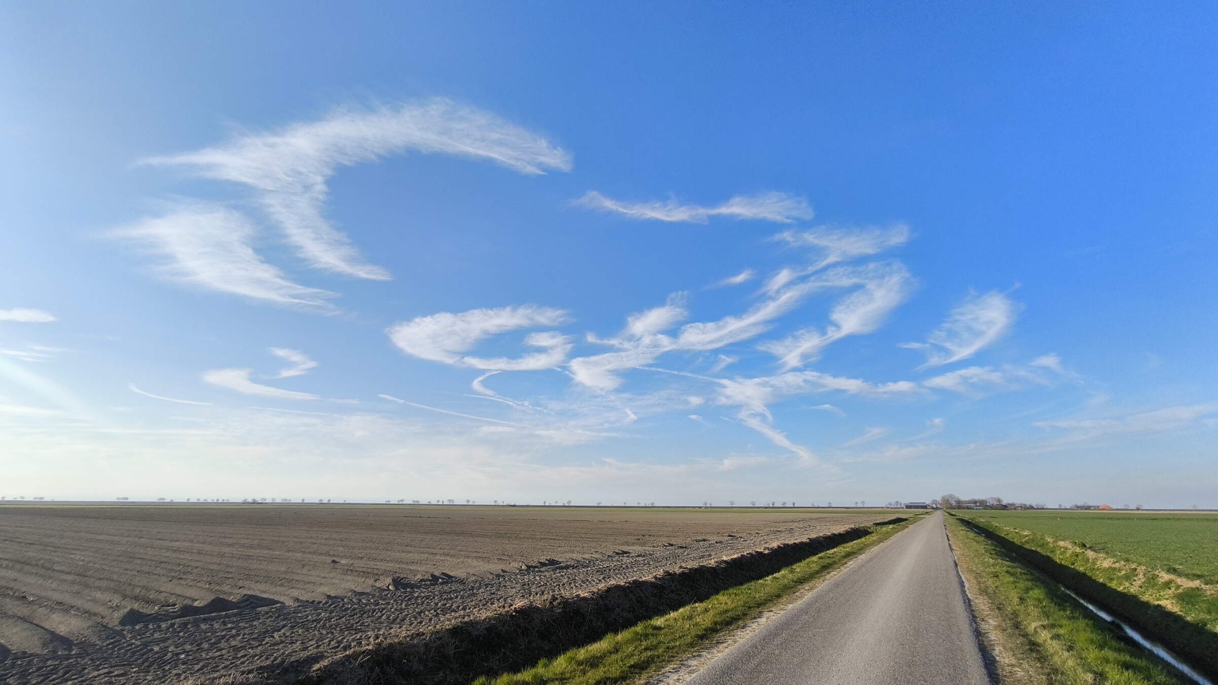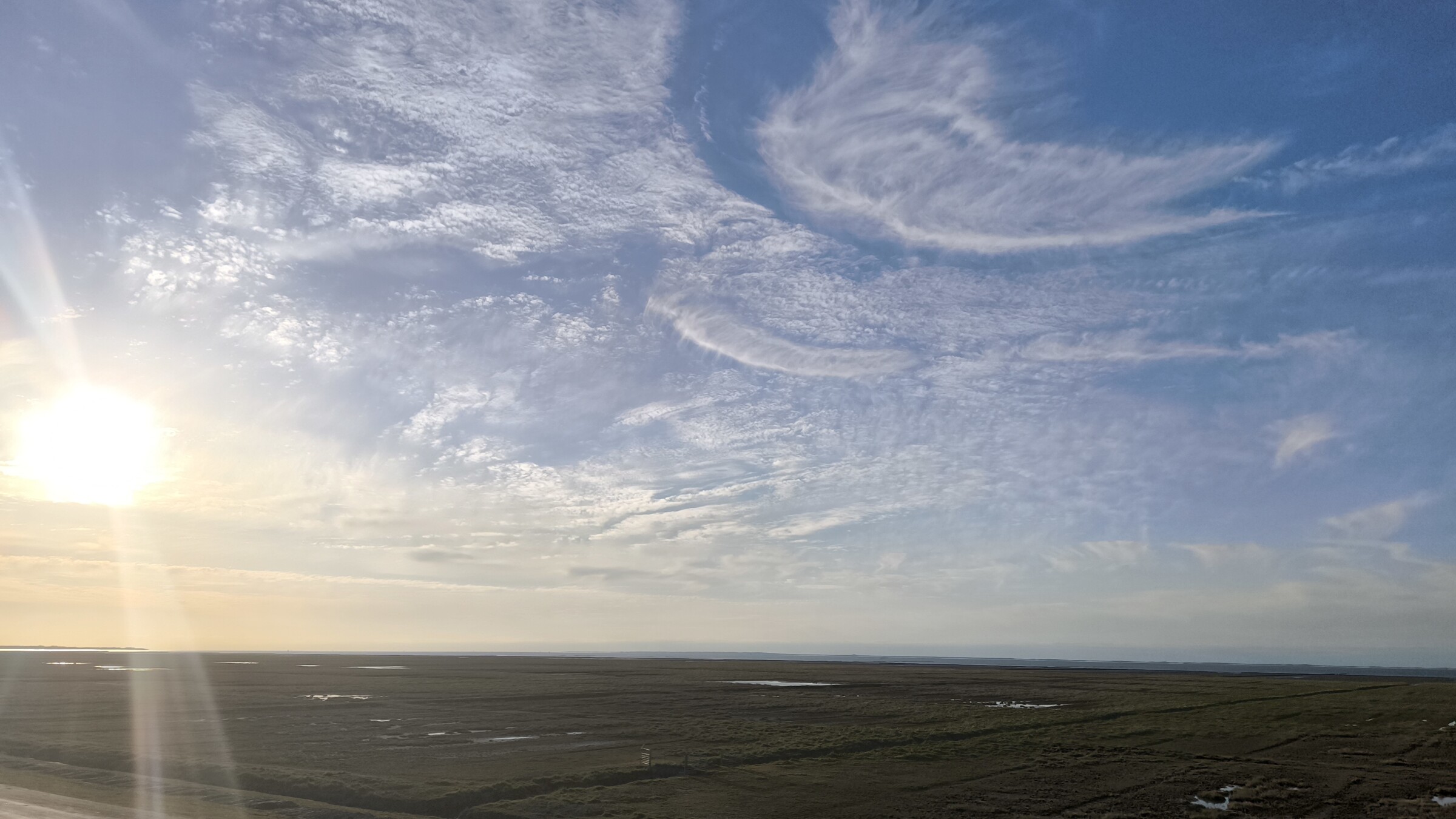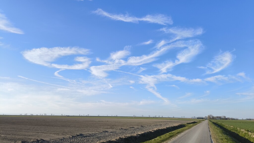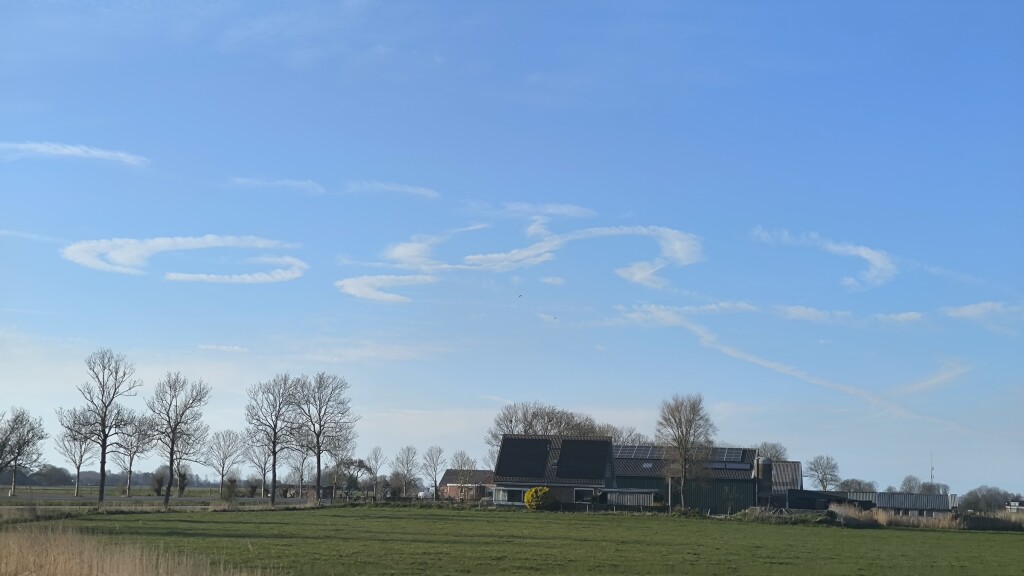 De vele vliegbewegingen van de internationale luchtmachtoefeningen laten bizarre contrails achter. Contrails die uitsmeren tot schitterende windveren. Daartussen nog enkele fallstreak holes of pilotengaten. Mooie maar koude avond aan de Noordkust.