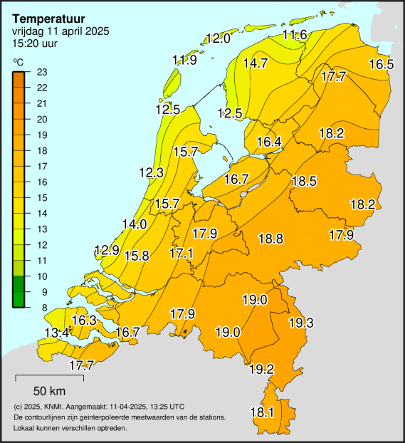 Met aan de kust lagere maxima en in het noorden zelfs frisjes. Verder landinwaarts toch richting die befaamde ‘warme dag’ oftewel 20 hele graden. Het spekkoekgehalte kan echter nog veel hoger. We zien het vooral op warme dagen in april en mei waarbij de maxima landinwaarts 25+ worden en aan zee de wind later op de dag draait (wind van zee).