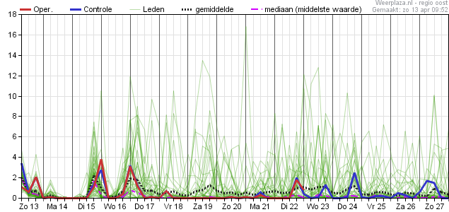 Ik lees hij KNMI over de periode na dinsdag: 'Daarna overwegend droog en perioden met zon.' Als ik dan de neerslagpluim voor Oost-NL zie, zie ik toch heel iets anders...